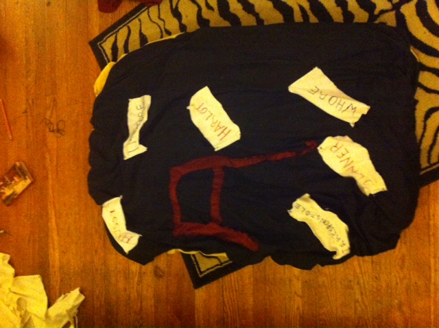 yellow sheet, white sheet, red fabric, shapies etc. Then I came up with the