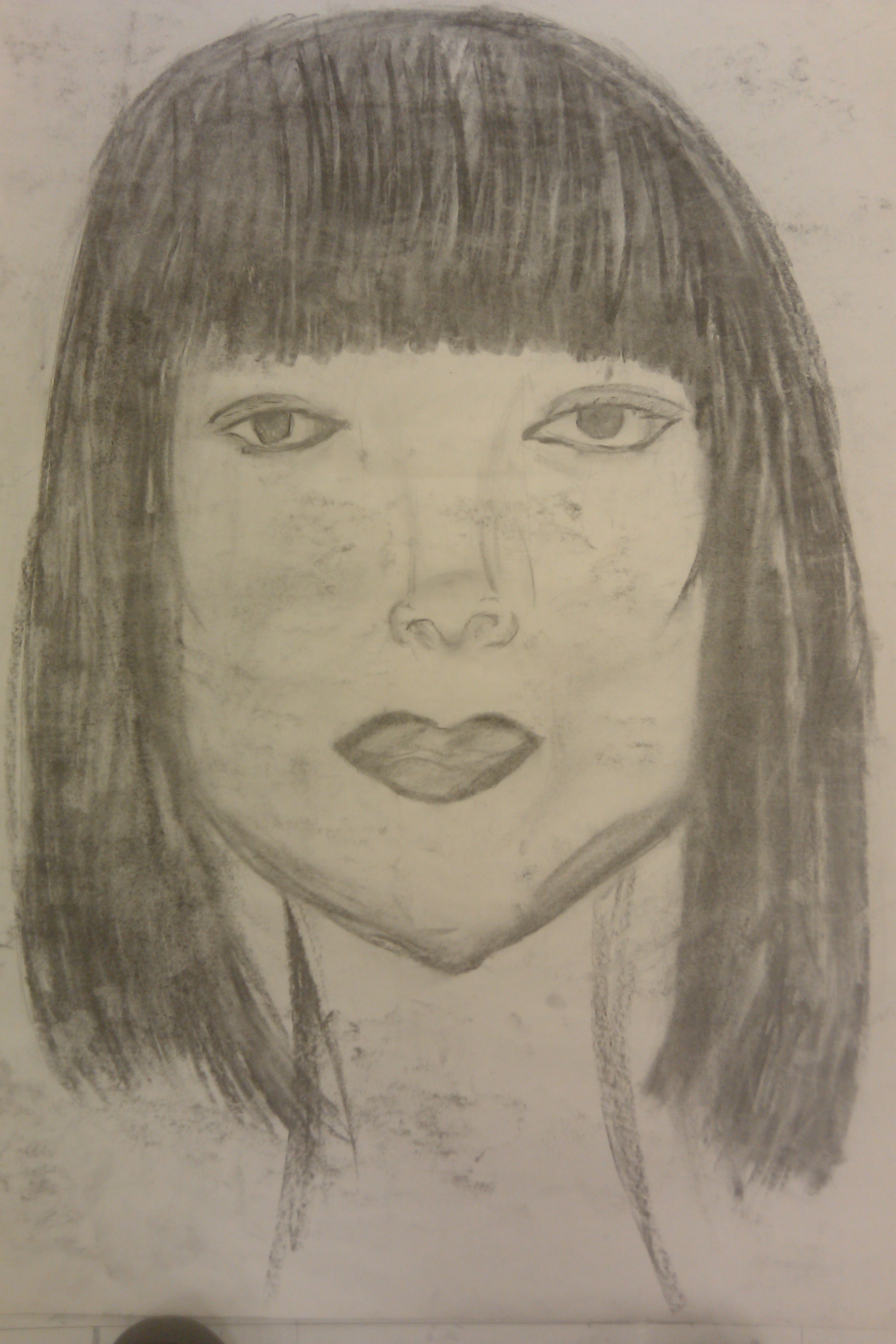 Going in to this project, I was so confident. I did the smaller portrait so now I’m a little more comfortable. But the only thing I was nervous about was drawing on big paper. Trying to draw at a bigger size is difficult. But I started out on what I know, so first I drew my head, and made sure my chin was looking right. The mirror is a big help because if you draw what you see it will come out great. Then I started with my eyes, but this time. I added shading and darker lines, so it can look more real. My nose I did better this time, better than the small self-portrait. My hair was different style from my smaller self-portrait, so my ears were covered. I added shading in my hair and then tried to show my cheekbones more. I was happy with the final product.