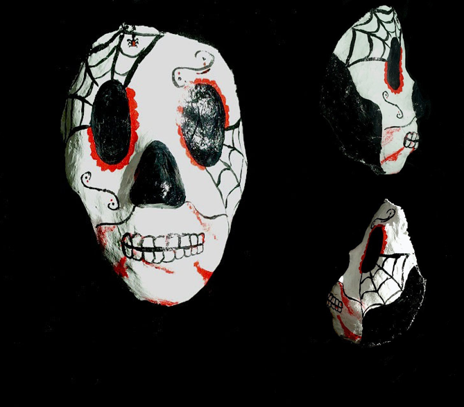 Q1 Senior Art Benchmark - Q1 Benchmark for Senior Art was to create a Sugar Skull design that presents both features of the original design of the traditional Mexican heritage with touch of your own creations within it. Sugar Skulls are a traditional folk art from Southern Mexico used to celebrate Day of the Dead that involve colors and effects that represent vibrant colors and detail. The process of my product was to incorporate a traditional skeleton/zombie feel for Halloween. To get my design I used my own face as the structure from water paper plaster and waited for that to cool. Once I had hard mask I then copied my design our my sketch book onto the hard product. After the drawing part, I then began to paint on my design. The finished product was then glazed for a finishing look.