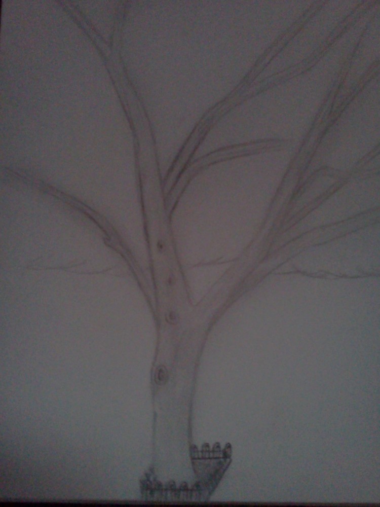 Outside Drawing: This is a drawing of a tree outside. Since drawing every single leaf on the tree can be frustrating and way too time consuming, I drew the tree as if it had a bush of leaves, then extended the branches into each other and off the page. To me, it looks like it symbolizes the way a tree changes during the seasons.