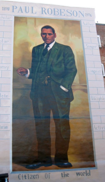 En mi comunidad hay un mural en la calle 45 walnut. Es una foto de Paul Robeson. Él es un hombre de Filadelfia ques es mucho de lo que mi comunidad se trata. En el mural las palabras dicen lo que. Fue escritor, cantante,activista, erudito y mucho más. Mi comunidad abarca todas estas cosas.En la foto lleva un traje verde. El fondo es marrón clare.