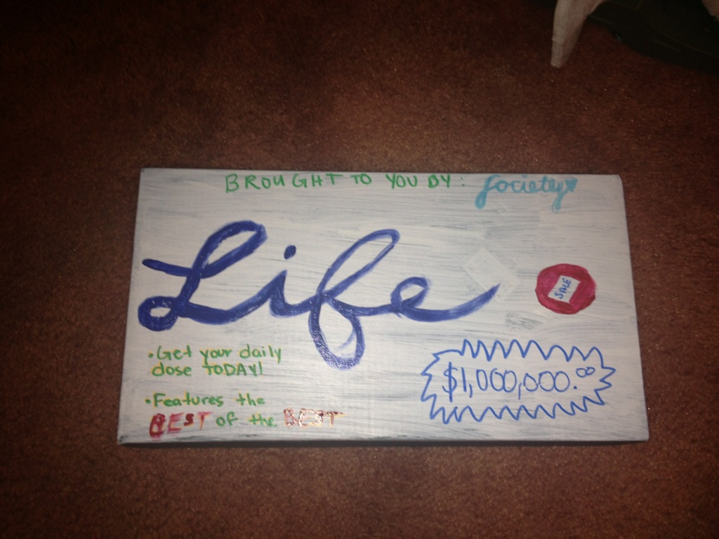 My creative portion of this project was creating a "medicine" called Life. Hazel is constantly talking about how she is a side effect of life. Inside the box are society's idea of perfection; Nina Dobrev, Scarlett Johansson, and Blake Lively. On the back of the "medicine" it shows the sides effects which are Hazel and Augustus with their additions that are necessary for them to live. Below the side effects are the items "no longer available." These items are the people that were listed to be dead at the meeting where Augustus and Hazel first met.