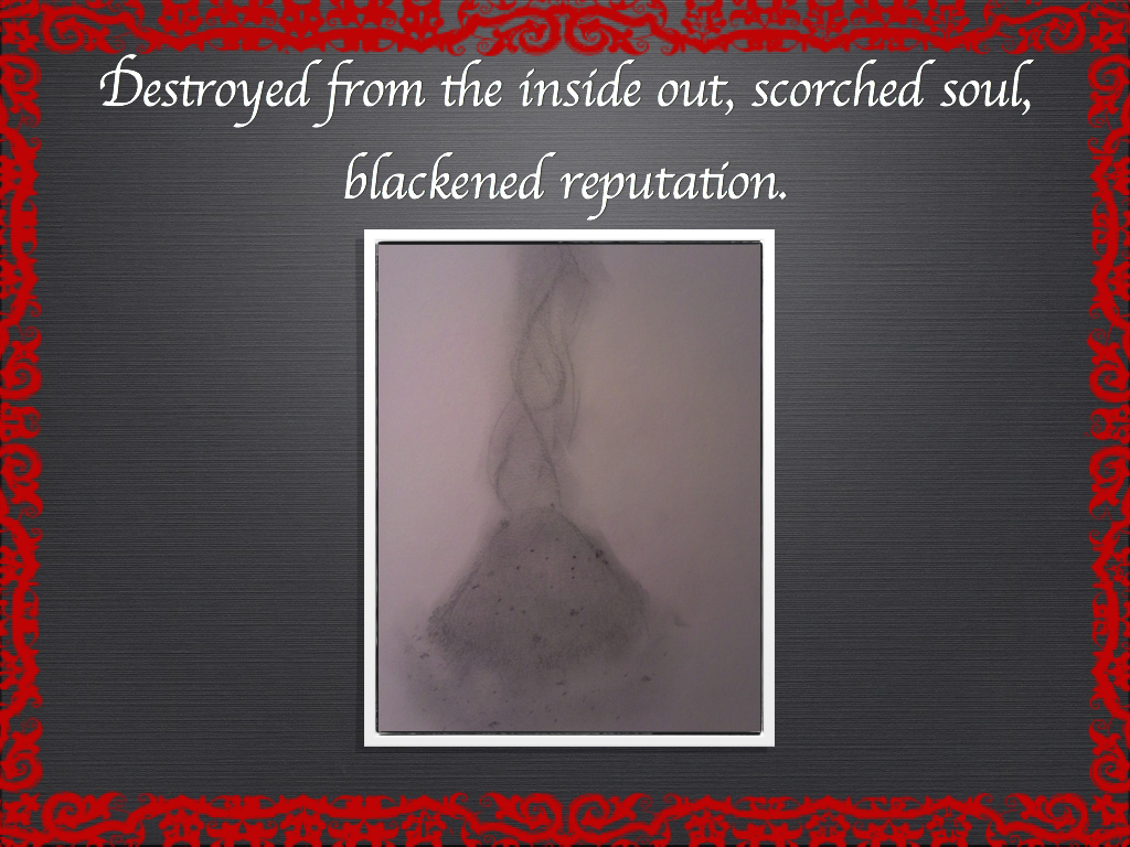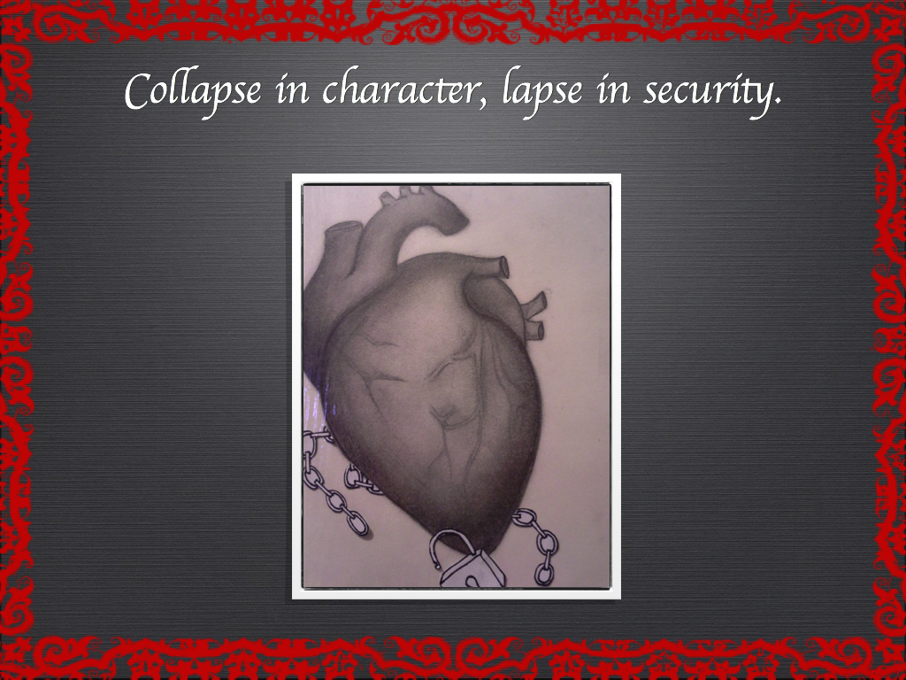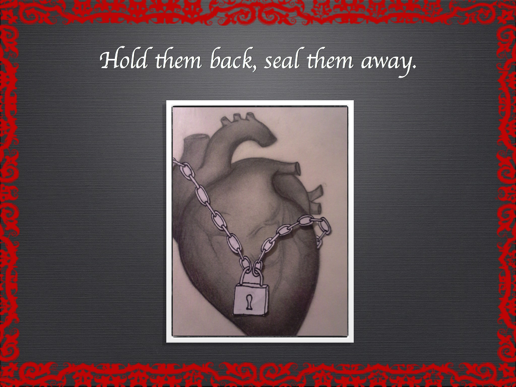 The theme of my creative project is “secrets and their consequences.” I got this point across by making a succession of heart drawings that could represent how secrets could affect a person. The first is a heart that has a lock and chain on it. As a caption for the picture I have, “Hold them back, seal them away.” This symbolizes someone who has a secret; they would try to hide it from the world, and in the process, they would hide themselves and their true feelings away. The second heart has a lock pointing towards the lock and chain. The caption I have is, “Prying eyes see through the lies.” This symbolizes people who may try to see past the exterior of a person and potentially find their secret. On the third heart, the lock is unlocked and the chain is falling. The caption is, “Collapse in character, lapse in security.” This symbolizes what happens when someone is afraid that someone may know their secret. They may become paranoid and start acting out of character because they are afraid they could not hide their secret. The fourth heart is on fire. The caption is, “The guilt burns; the heart’s an inferno.” This symbolizes the guilt someone would experience while holding the secret. It would feel like the secret is burning them from the inside out. The last picture is a pile of ash. The caption I have is, “Destroyed from the inside out, scorched soul, blackened reputation.” This symbolizes someone after they have held their secret for so long. Either they would feel terrible about holding that secret or someone would find out about their secret and no longer trust them; it would ruin what others think of them.