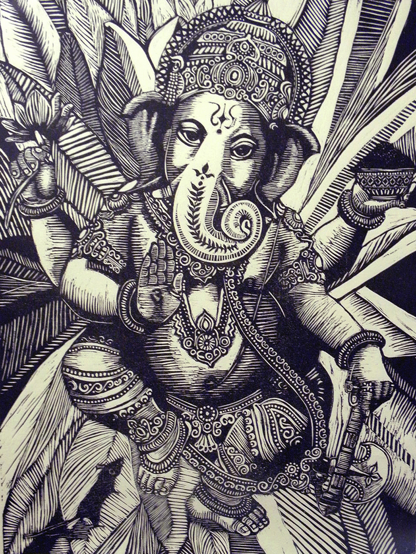 This is a buddhist elephant and each hand is carrying something different that represents something. There’s a rat in the left bottom corners that can represent somebody stealing. The use of dark spaces is dignifying that it’s a 3 dimensional figure. The design is very detailed.