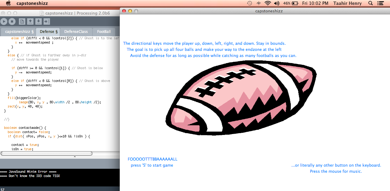 The purpose of this project was to help me gain a better understanding of computer coding. I've always been interested in the process that goes into making things appear on a computer screen or within a window on a program when playing video games. I decided to try my hand at making a game with help from my four day a week computer science class. Since I decided to use processing™ I gained more experience using a computer language based on Java. Through the process of thinking of a game to make and then writing the code for it, I believe that I am more prepared for my intended major which may involve coding with a language like java.