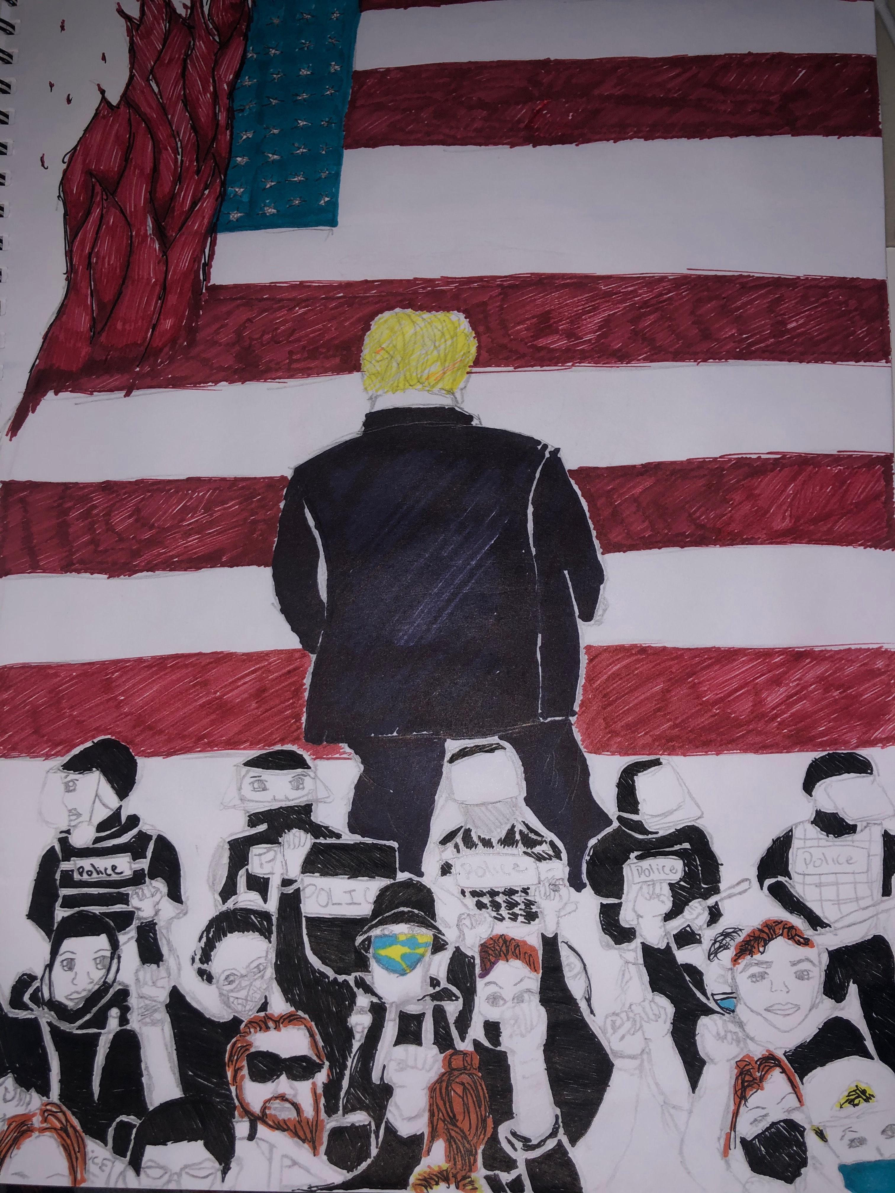 2020 hasn’t been the best way to welcome the new decade. It sure has been a roller coaster, Virus, Police brutality, and it’s election year. Yet the world has corona, but America is having so many more problems than just a virus. The sad part is that these problems aren’t new, they have been seen for so long, but no one makes a change. I made a drawing to represent what my 2020 looks like in my point of view. People protest for a change, but yet they wear masks, because there’s a virus around them. President Donal Trump is seen walking away, refusing to hear his people. This puts a single story into Americans, people see american as an unfair place, and it shouldn’t be like that. We are slowly making America ungreat. This is also why I made the background as the american flag burning. It’s not a hateful way, but because America is slowly burning, people aren’t heard and find a way to be heard. They start to destroy stores and burning stuff. Yet, the president still walks away from it. The BLM movement has been coming out a lot, seeing this as a chance to be heard, many other movements have also come out to make their problems known. America, hasn’t also been the only place in the world with pain, other countries have been fighting for survival. As a teen living in this country, I have felt unsafe, and sometimes worried about my family. We have tried to stay safe in quarantine, we try and spend time together, and it’s a good way to get closer to your loved ones. But with the countrys actions of treating non-white people is worrying. I’ve seen in the news that kids are being put in cages like animals in the border. Sometimes, I think, what if it was me? What if it was my siblings?. It’s not much about me, but my siblings. I can’t do much being 14, but if I had much more power, I would use it for good. 2021 is around the corner and everyone is praying for a better year, with a better view. Time is being wasted, lifes are being taken, it’s a change for today.