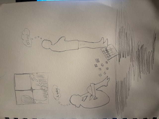 I made very specific artistic choices while creating this. To start I have the commander with his back facing to Offred, this shows the complicated relationship between them. Even though this is rather unusual for a commander and a handmaid to have these private moments they continue to do so. The bubble above his head shows his thoughts of Offred. His enjoyment of the time they spend together and her as an individual rather than her as a handmaid. It’s a confusing feeling which is why he stands with his arms crossed. Across the room is offered. While we know she never actually lays on the floor with her head buried in her knees I made her in this position to signify her upset feelings towards the whole situation, her emotions as a handmaid and being this new version of herself. In the bubble above her head we see the name Luke. In all this time they spend together Offred can’t help but just think of Luke. Where he might be, their memories together, their child together and him as she can’t forget their love. On the floor between the two we can see scattered prices of scrabble. The game the two of them play together. The reason I scattered it was to signify the unwillingness to want to play on Offred’s part. How she doesn’t enjoy it like he does and how she wishes to be freed of this isolating life. It’s confusing for both of them. The game is nothing but an object in their unique relationship. It doesn’t signify any fun. That is the reason for that chosen element in my art work. Finally I drew a window behind Offred. I don’t know for sure the layout of this room. Although I added this to represent the distance between the outside work of nature and fun and the house she finds herself always in. The wanted feeling of freedom lingers behind her. The path of stones is to be seen in the Commander’s Wives garden.