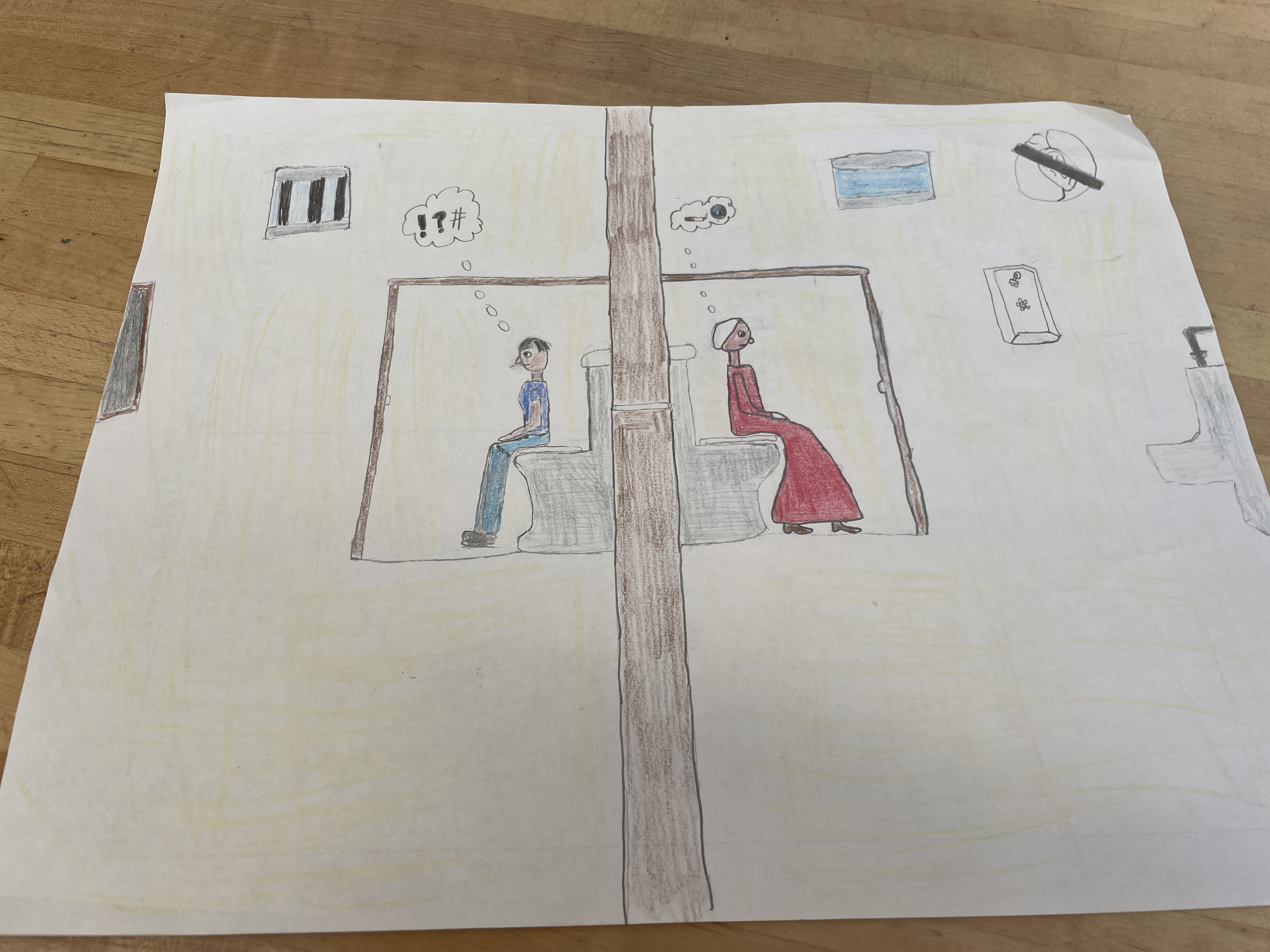 This piece is of the scene in chapter 13, of the bathroom stalls with Moira and Offred. The two of them go into stalls next to each other so they can speak to one another. This scene represents the only safe place at the school where the maids could talk with each other. Without the Aunts hearing in on the conversations. They spent their time there to just be able to talk. With these stalls being one of the only places they could connect; through a small hole in the wall of the two bathroom stalls, a relic of the past. Offred mentions this on (pg.73) “In the wood there’s a small hole, at the back, next to the wall, about waist height, souvenir of some previous vandalism or legacy of an ancient voyeur.” This small hole in the wall is the only reason they were able to connect so I made it the center of the drawing. Though the stalls are next to each other in the book I wanted to put them side to side to be able to see the characters.