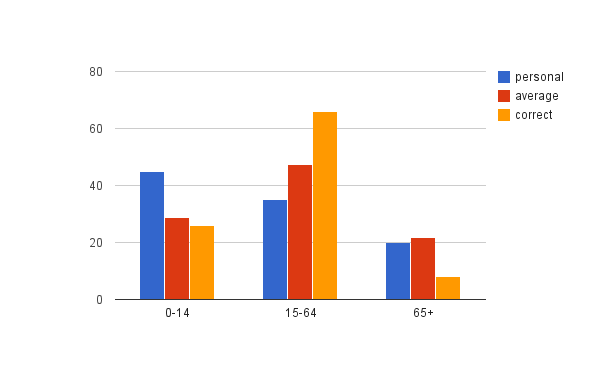 The first graph shows my personal, average, and correct answer of the percentage of different age. It is interesting because it really shows how big the difference is between three sets of data. I never thought that there is that much percentage of people between the age of 15-64.