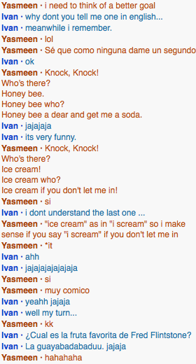 Ybrownlee Blog 5 Posted by Yasmeen Brownlee in Spanish 3 - Gierke on Wednesday, May 23, 2012 at 9:05 am This weeks goal was a run off of last weeks goal was about obtaining jokes and knowing how to speak about where you are from and what it feels like.Screen Shot 2012-05-22 at 5.18.16 PMScreen Shot 2012-05-22 at 5.44.52 PMScreen Shot 2012-05-22 at 5.45.01 PMScreen Shot 2012-05-22 at 6.02.46 PMScreen Shot 2012-05-22 at 6.21.35 PM Comments No comments have been posted yet. Log in to post a comment.