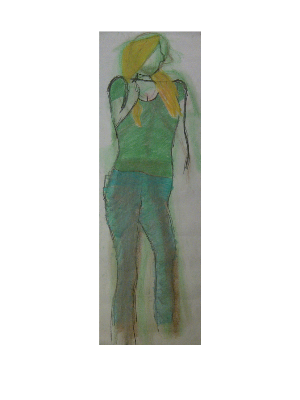 I did this drawing because I was assigned this drawing. during this drawing I 1st outlined the way I seen this person standing. Once I outlined the way this person was standing I then added a little more detail by drawing the  clothing on to the person and using the colors that look like the colors she was wearing. Last I added detail to clothing and finished drawing her face and hair.