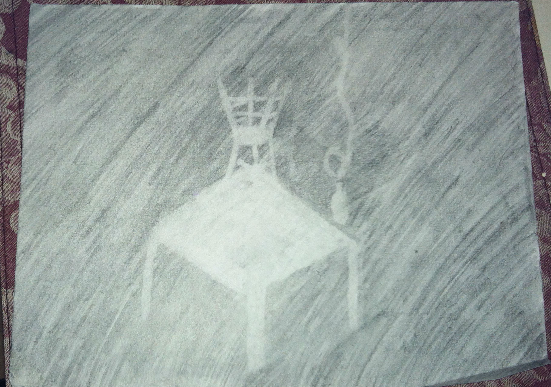 I found negative space in my cut out picture and in my stool drawing within the spaces in and around the subject. For the cut out piece I focused on the black and grey in the picture we were given. First, I cut out all of the parts of the picture of the house and traced them on one of the pieces of construction paper. Then I arrange the pieces that matched the black parts of the picture onto one half of my other piece of paper. Then, I arranged the remaining pieces that matched the grey parts on the second half of the full sheet of paper. The finished product was a picture of a house with the negative and positive space colors reversed on each side. Also, my technique for my stool drawing was that I shaded the entire paper and then erased the shapes of the subjects which were the table, stools, plant, and wire.