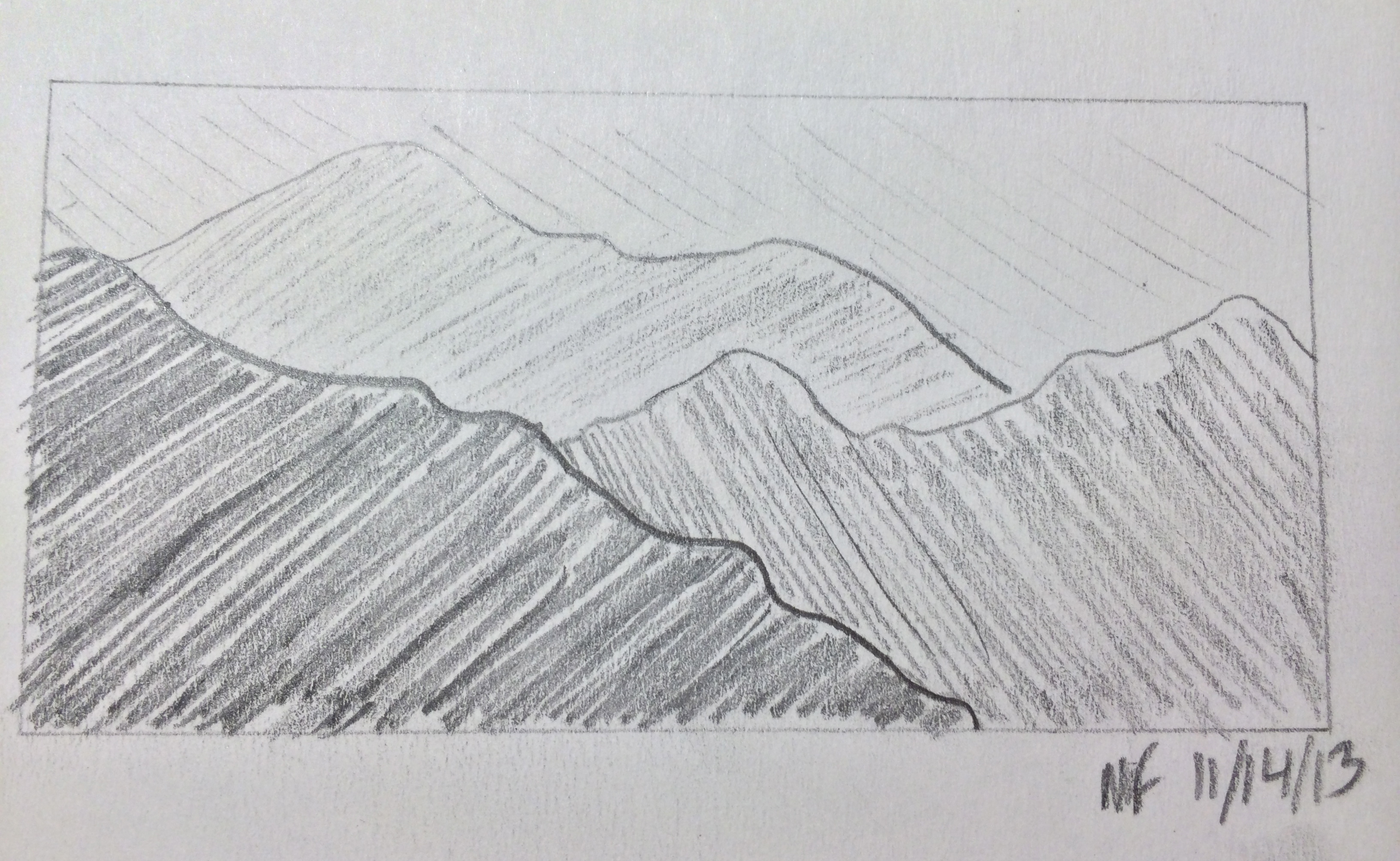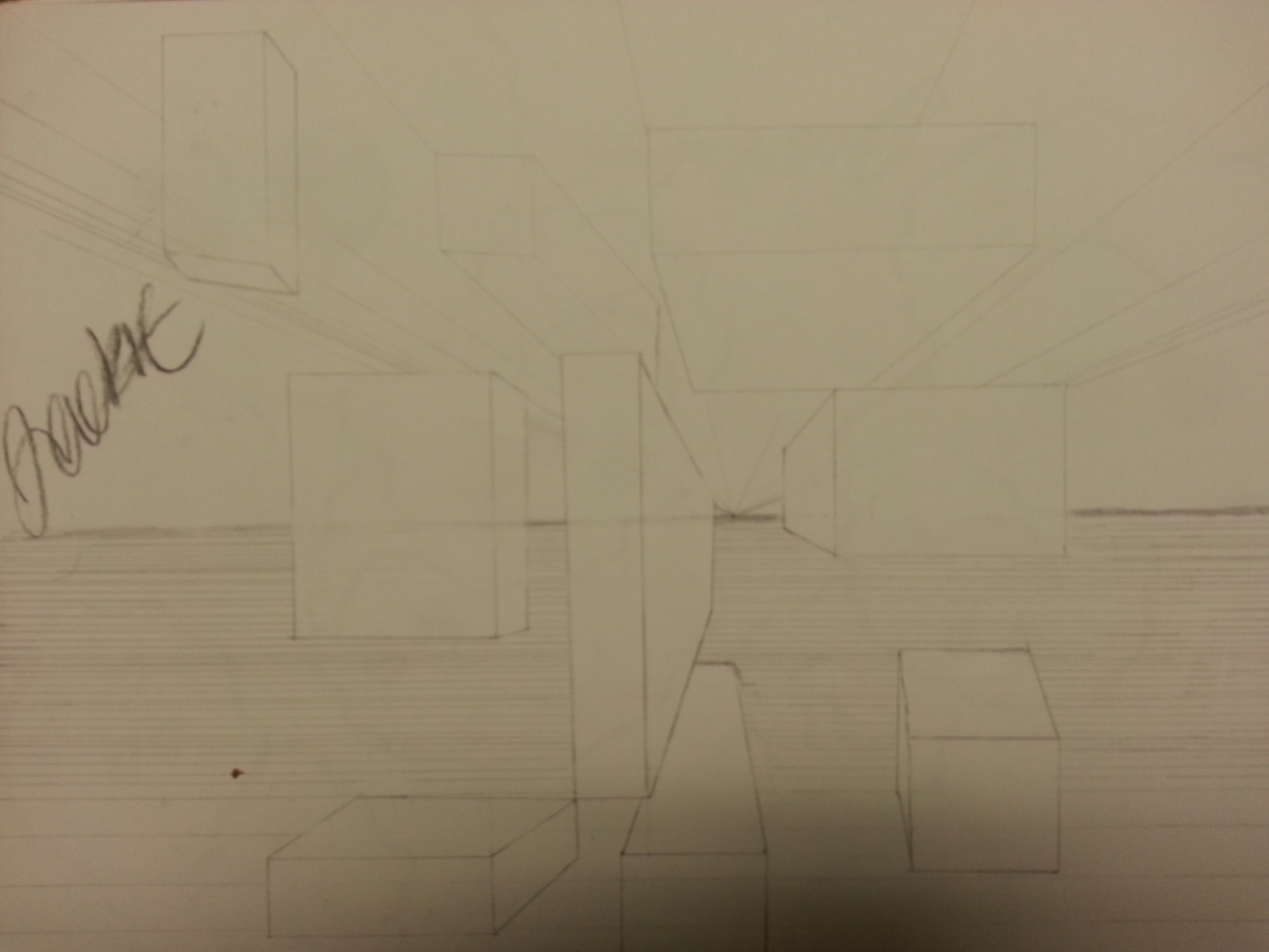 In the different exercise’s I was creating a foundation by using the simple skills of perspective.I am working to overlap my drawings, creating depth in each drawings . This gave my drawing a very geometric perspective.I have created art work with distance , space I was able to create these different perspectives with the knowledge and use of atmospheric perspective. There are many lights and darks in this subject.