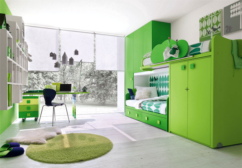 La dormitorio de los niños es divertida y interesante. Los camas es verde y los escaleras es amarillo. Es dos gabinetes y una lampara.