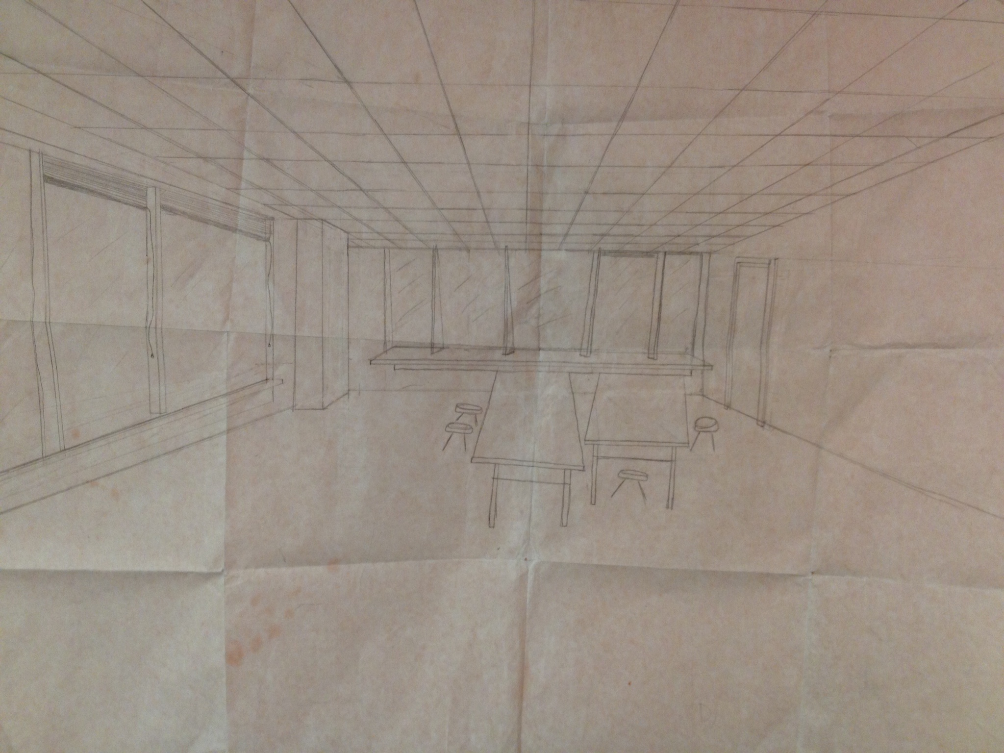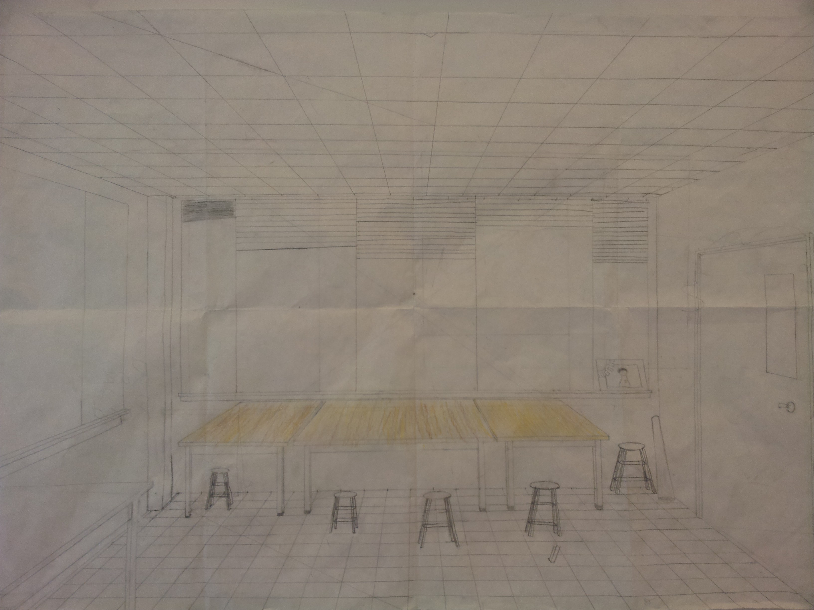 I did not know how easy it was to create such defined images that look real. Manipulating lines and things of that such makes things look incredibly real and I felt very accomplished that I drew it. I understand how people see things more. In doing one point perspective I can find ways to draw objects were you can see and arial view of them. If I were do redo this project I would try to take more initiative and draw some of the artwork on the ceiling tiles and things of that such. My advice to one who has never done one point perspective before is to use your artist eye as much as possible and be as diligent as possible with whatever it is you are drawing because it is only hard if you over think it. My ruler, because I could make straight lines and have neat orthogonal lines.