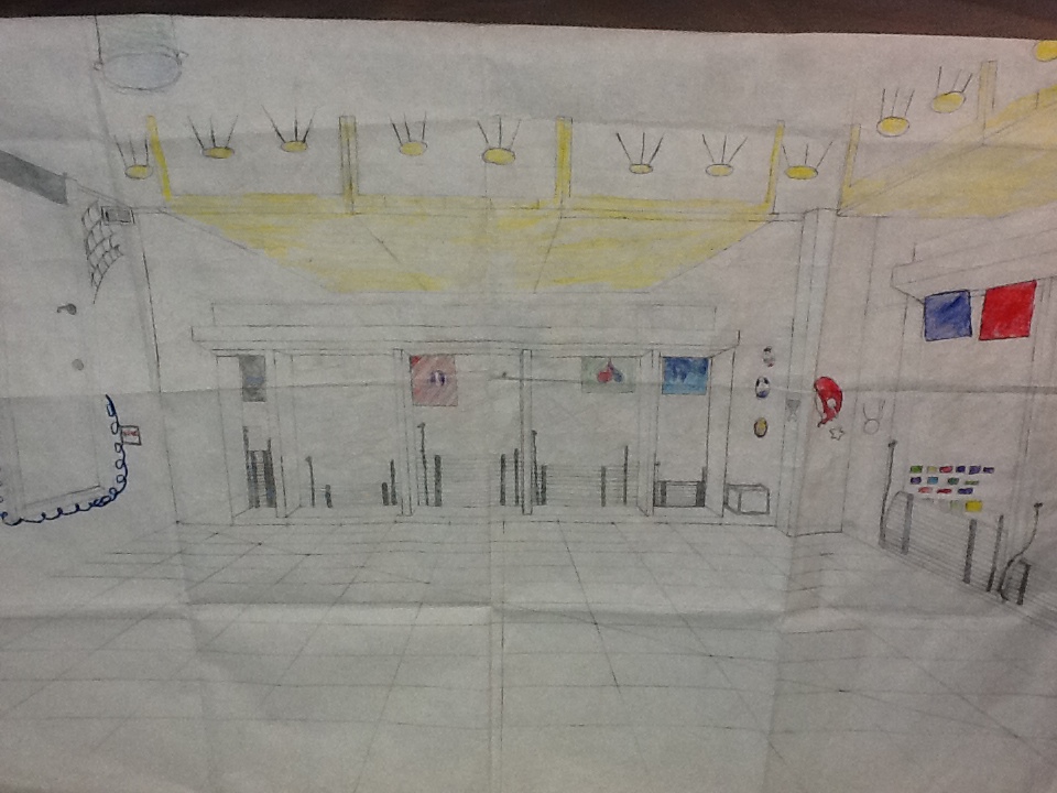 I think if I did the assignment again, I would definitely take more time to finish the actual drawing before doing all the details. I started drawing everything on the ceiling tiles before I finished drawing everything else, and it made it hard to finish at the end because I was running out of time. I would definitely need to use my time better, because it was really stressful at the end, especially because I had to color in the entire picture at the end. Coloring my drawings is usually not my style, so I just added a few bursts of color in certain areas such as the tables, stools and wall. I also added a small amount of color in certain ceiling tiles. I was actually pretty proud of the outcome.