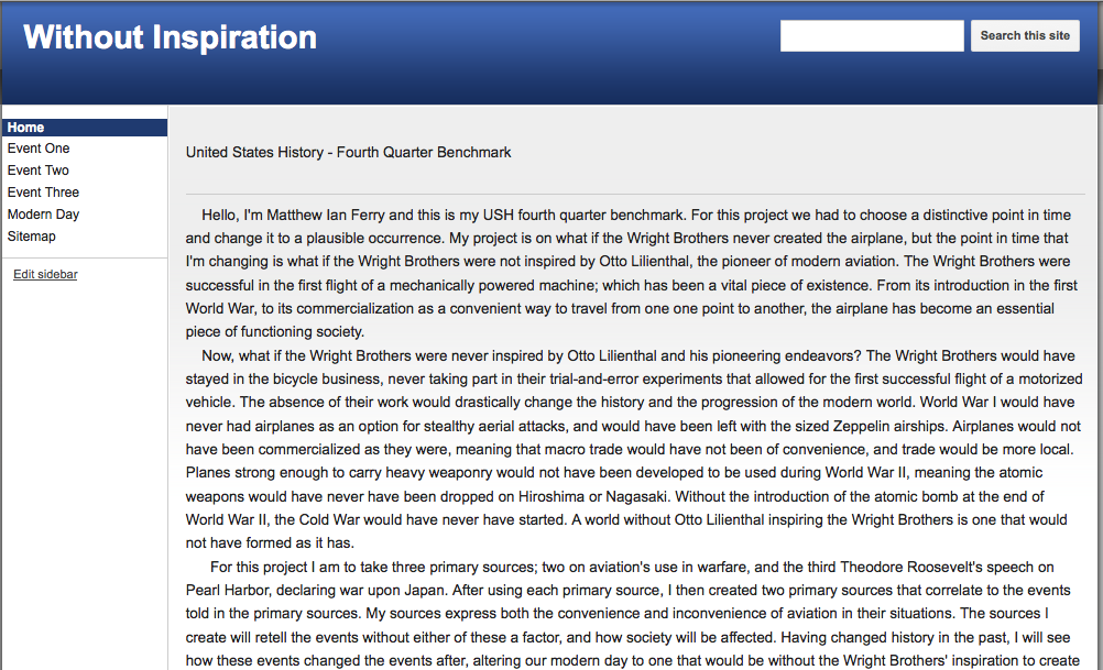I enjoyed this project. Taking an event and manipulating it, altering history was awesome, and reminded me of the butterfly effect; showing that with one small change in history can completely rewrite the world. This was also the most challenging part for me, as it was difficult for me to find a specific event to focus on; I had a ton of ideas that I really wanted to work on, but I felt like this would have given a fairly interesting future. The Wright Brothers being so moved by Lilienthal's pioneering to create their own experiments I found was particularly interesting, as it shows just how much someone can inspire another.