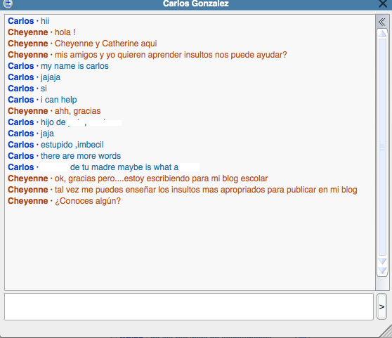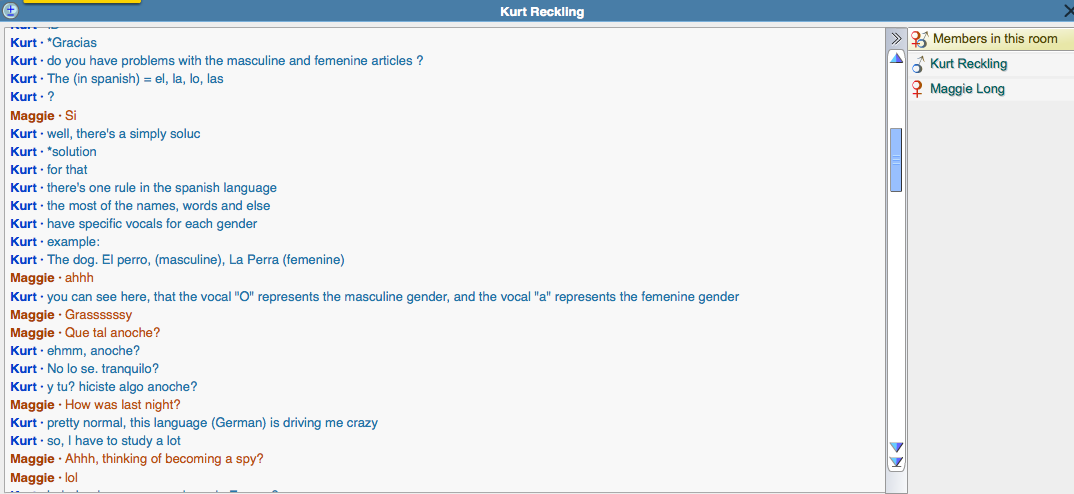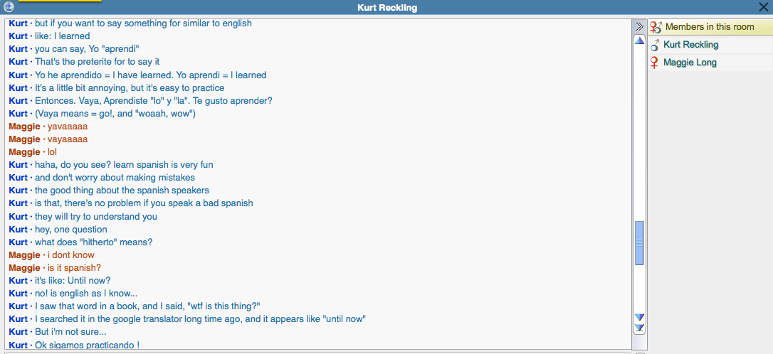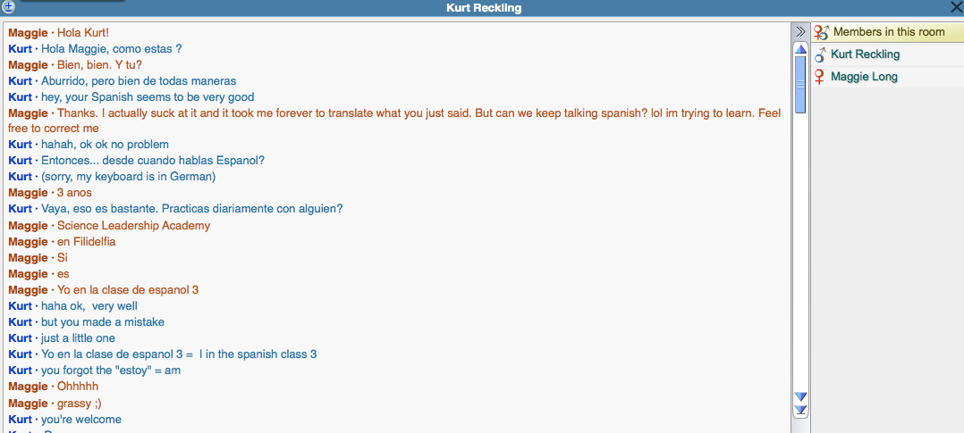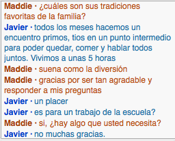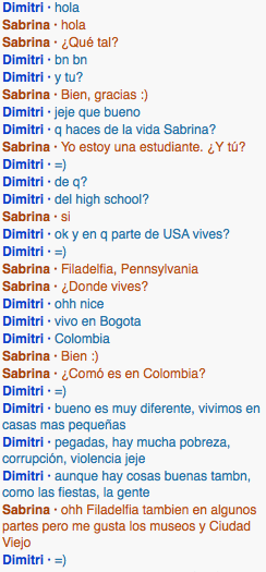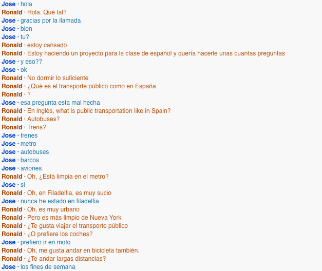 My partner taught me that commuting in Spain is much like commuting in America. I learned that my partner is a very nice person, although he does have a short attention span. I learned that I enjoy talking to others, as the conversation lasted for a while once again. As we spoke more and more, I became increasingly interested in his cultural traditions. Once again, I was surprised that he was so friendly. If someone tried to chat with me about a school project, I doubt that I would be as cooperative as he was. I am proud that I learned something from the chat. I had a fear that it would be useless because no one would actually accept my chat request. Next time, I plan to talk with more people at once.
