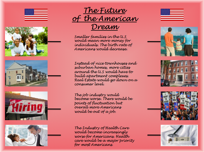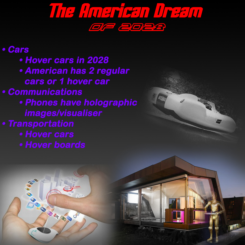 The transition from the modern day american dream and future american dream will be the effect of a brutal war that causes all of technology to be destroyed. the people of the future will live like the first people who roamed earth. This will cause the dedication to finding religious explanations to their existence. The new American dream is to prolong knowledge of the human existence.