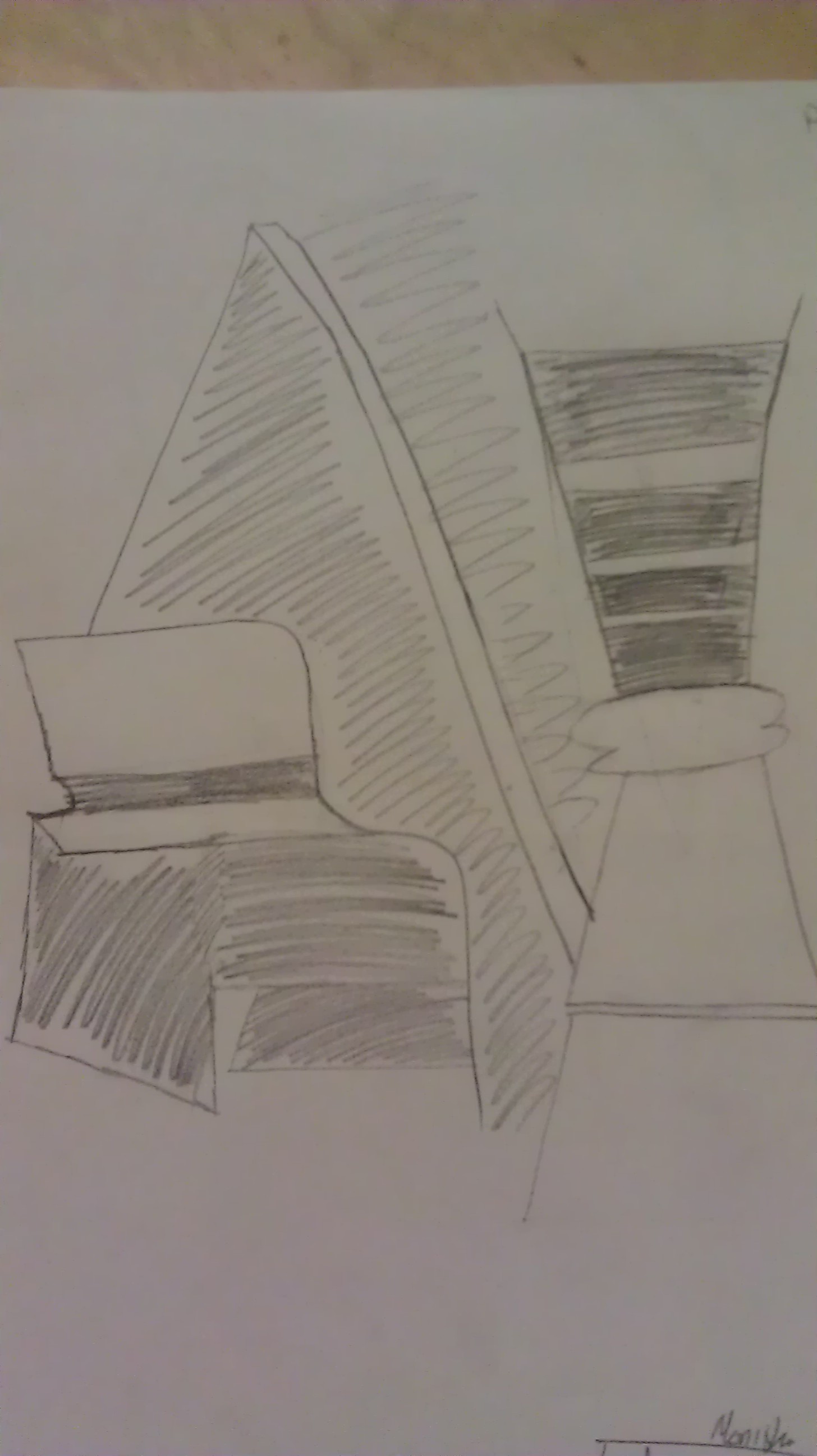Well, you first draw the stool and everything, and you look at everything that is not in the main focus, meaning that when you draw a negative space, your drawing the outling of the image, not in between the spaces .
