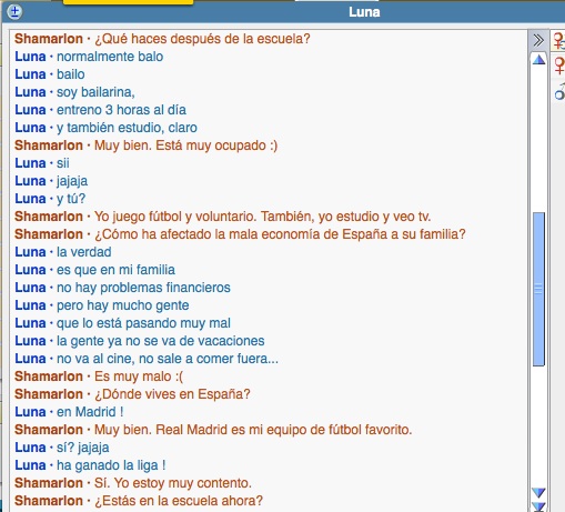 I was able to get all of my questions answered and even after this, I still kept the conversation going. I also responded to Luna's questions about my life in the United States. I did not just keep on asking questions after questions. I not only gain valuable knowledge about Spain but I also got the opportunity to tell Luna about my daily routine and what I do on the weekends and after school.