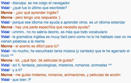 I learned that he like sci-fi, mystery, romance, and just about every other kind of movies except for cartoons.We also talked about areas where I thought I needed work in Spanish. He gave me examples of times when certain tenses are used in everyday conversation. I also learned that he nearly perfected his English accent by listening to music.How did this interaction help you move towards achieving your personal goal?