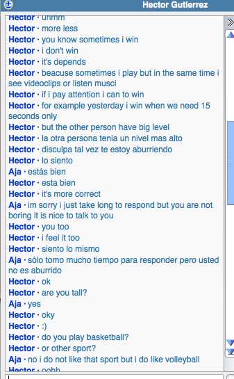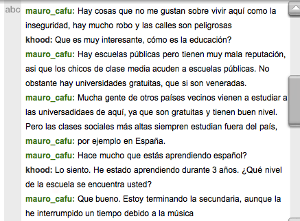 The person I talked to was very nice and they answered all my questions I needed to know about they're country and they also told me about themselves as well. They told me how the streets aren't really that safe and there's a lot of crimes/thefts. As for the education, neighboring countries come to learn in their country. They have a lot of public schools as well. The country of where he is from is where the "Tango" (dance)came from. This guy is also in a rock band (He's the guitarist) and him and his band play at clubs and events. Overall, this was a nice person to chat with.How did this interaction help you move towards achieving your personal goal?