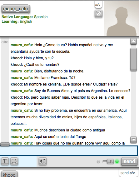 I spoke with a guy named Francisco who is from/lives in Argentina in a city called Buenos aires. I met this person through livemocha.com. I technically did not choose this person, but I am glad I did because they taught me a lot about Argentina.What did you learn about them? What did you learn from them?