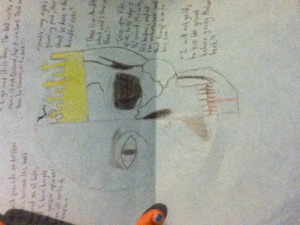 Macbeth has been on a journey. A journey full of lies/deceit, blood, and greed. In the picture that I drew I wanted to show Macbeth’s path in one 2-face picture. Macbeth has gone from a noble man to a tyrant. I wanted to portray that in the drawing. I’m going to start with the right side (or left, from your view). This is Macbeth’s human face, I made him bald because that’s how he looked like in the movie and I thought it was better than what I was going to draw. This side of the face shows his valor, bravery, and honesty. It shows a soldier worthy to fight for his country and will stop at nothing for justice. The skull side has the crown because he turned evil and something so dead after he became king. The blood in his mouth is to show how bloodthirsty he was in order to protect his golden power. The eye socket shows how hollow and lifeless he has gotten and the cracks represent him wearing down to his final fall, the blue paper represents Macbeth’s lost soul hidden away and gone forever.