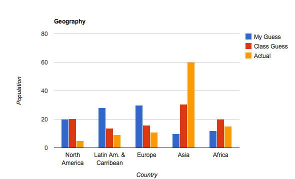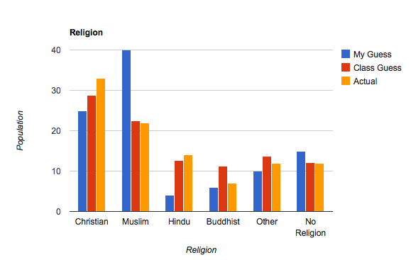 The majority of my answers were close to the correct answer but there were others that strayed very far from the correct numbers, especially in the language category. I think this assignment gives me a clear view of how I perceived the world, along with my class. Having lived in a city my whole life, it's hard to picture what the rest of the world could be living in/going through when only really seeing one point of view.