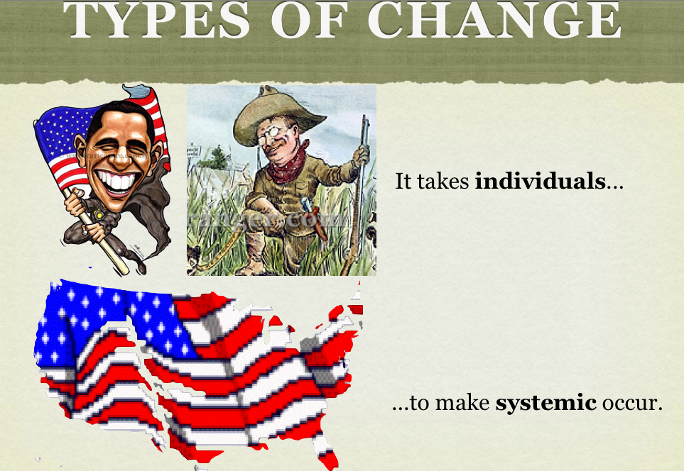 Systemic change is something that is inevitable. There are many details that pertain to systemic change, but they will change regardless. It takes an individual to set a trend to cause either positive or negative change. In this scenario, we focused on individuals who attempted to lead a systemic change. For example, during the time that Teddy Roosevelt was in office, he wanted to stop the overwhelming amount of monopolies. These monopolies were created by large companies and trusts. These companies used devilish ways to get money. They would force their buyers into purchasing something they did not want in order to get something they did want. In our visual presentation, we focused on Barack Obama and Theodore Roosevelt. They both wanted to create change in the economy and government. Theodore wanted to spread money around rather than companies hogging hard earned money from citizens. Barack Obama is trying to balance out the percentage comparison of high class to low class citizens. Initially, the gap between rich and poor in America is not only devastating but continually increasing. Obama is an individual wanting to create systemic change.