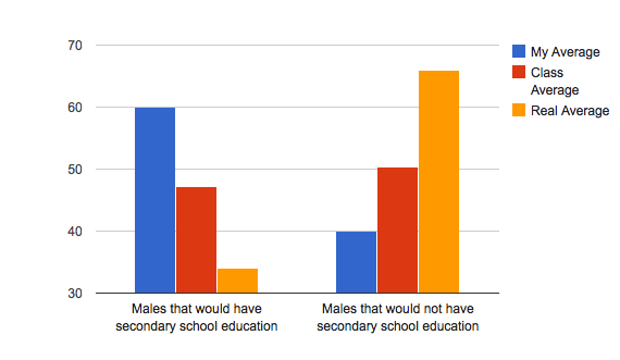 After comparing my percentages to the classes, I thought "okay, well we're pretty much on the same page." Once i saw how low the percentage was for those who do not have access to drinking water, I was shocked. I expected it to be higher, but then I was glad because the percentage I had was high. Not only were my percentages high for this graph, but I placed a high percentage for males who would have a secondary education.