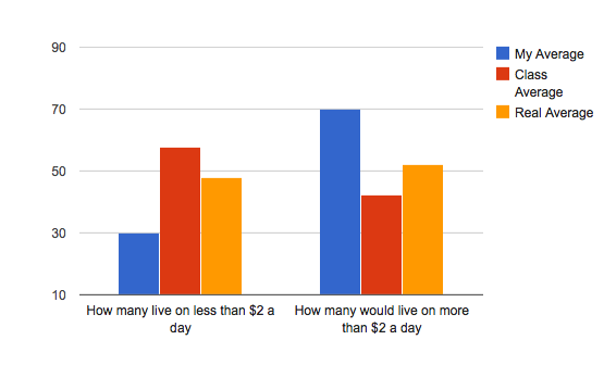 This bar graph compares my predictions of global poverty to class averages and real statistics. I was surprised to see that more people in the world live on more than 2 dollars a day than less, but after thinking more about it, I believe that this wasn't an accurate way of measuring poverty. Although the portion of the country that lives on less than 2 USD a day is small, I think that even if you live on less than 7 USD, your still fairly poor.