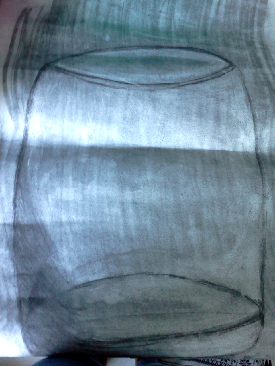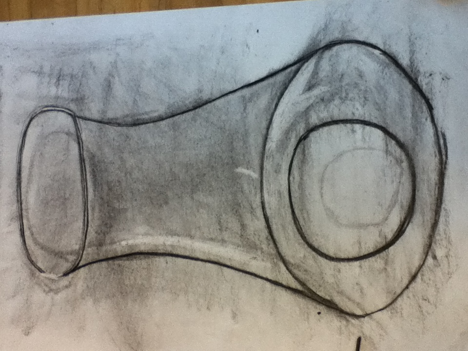 I had some trouble with the clear object drawing. It didn't really understand how to "shade" and make the object more 3D like. I started with covering the entire paper with the black charcoal and then faded the color to a lighter grey by taking a paper towel and lightly brushing the canvas. Next I proceeded to draw the outer edges of the vase. I tried my best to shade the picture to make it "pop" a little more, but I don't think I did a good enough job.