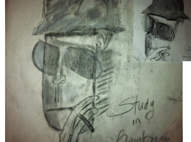 Copy the master was super interesting and a great project. I finally realized I can draw. This piece made me gain more confidence in my self. It's hard copying someone famous. So ms. Hull told us to find an artist any where or internest, in a book, etc. So i went to the shelf in her room and grabbed a book. I seen this strange but interesting photo by a guy name gamboge. So I got a 24x36 piece of paper, and then printed gamboge picture out of the painting. So I grabbed charcoal, and started with his big head, made sure the shape was right. Then I added the detail I seem such as his hat, nose, slim mouth, hands, glasses and cigarette. The hardest part was the shading, with out seeing natural light I had to copy where the artist shaded. I finished this in 3 hours. I loved this drawing, and the effort I out into it. I could have added color to add my own flare to it.