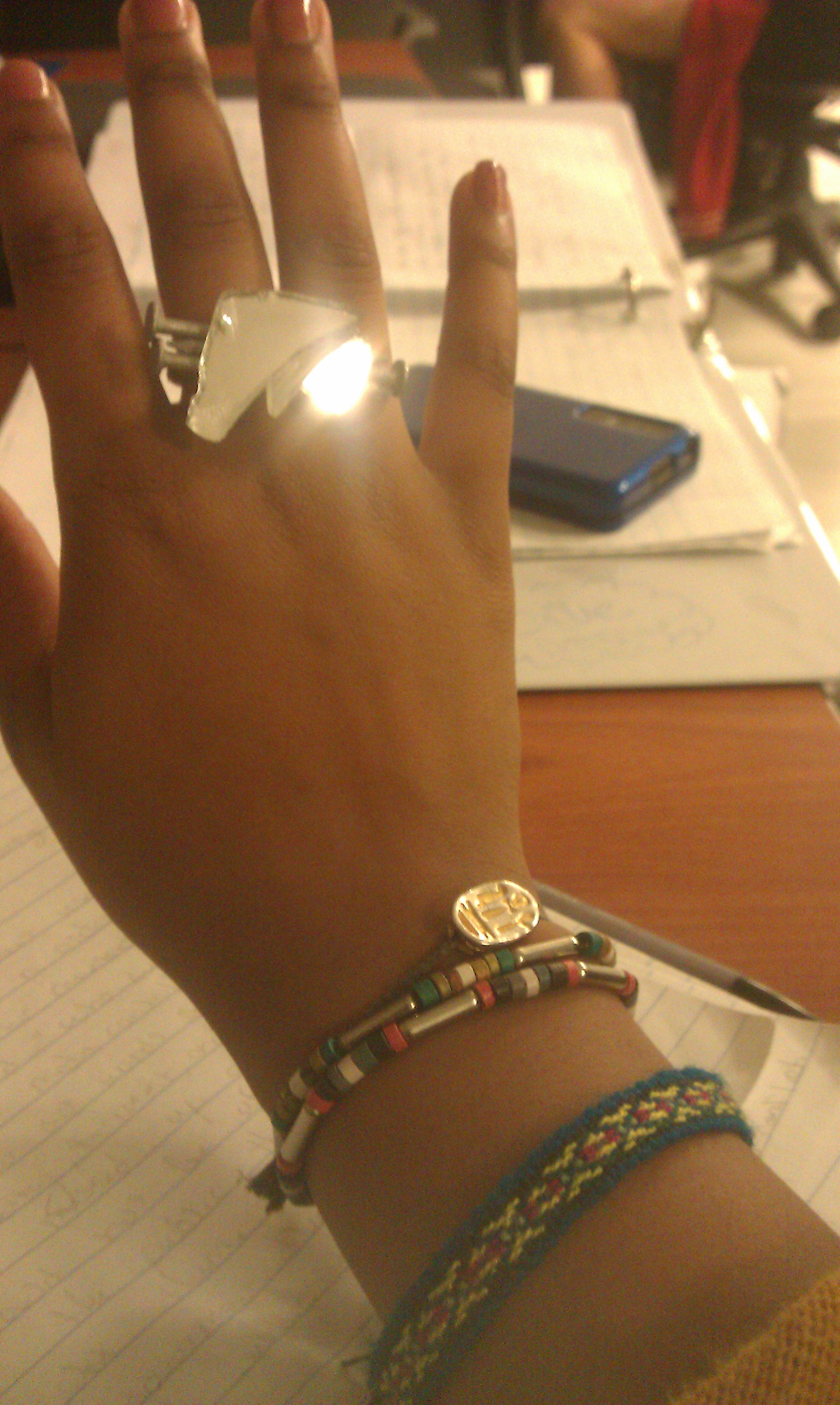 My other part of this quarter I remolded a ring my ring made with her new jewelry labeled called Purpose. The ring is made out of broken glass that was shaved down for safety and three nails that were shaved down as well, but it has a dangerous look. I also used wire and a cut up piece of wine cork that made the circle shape, which you put your ringer through. I love this piece and always wanted to do something with broken glass so I did so.