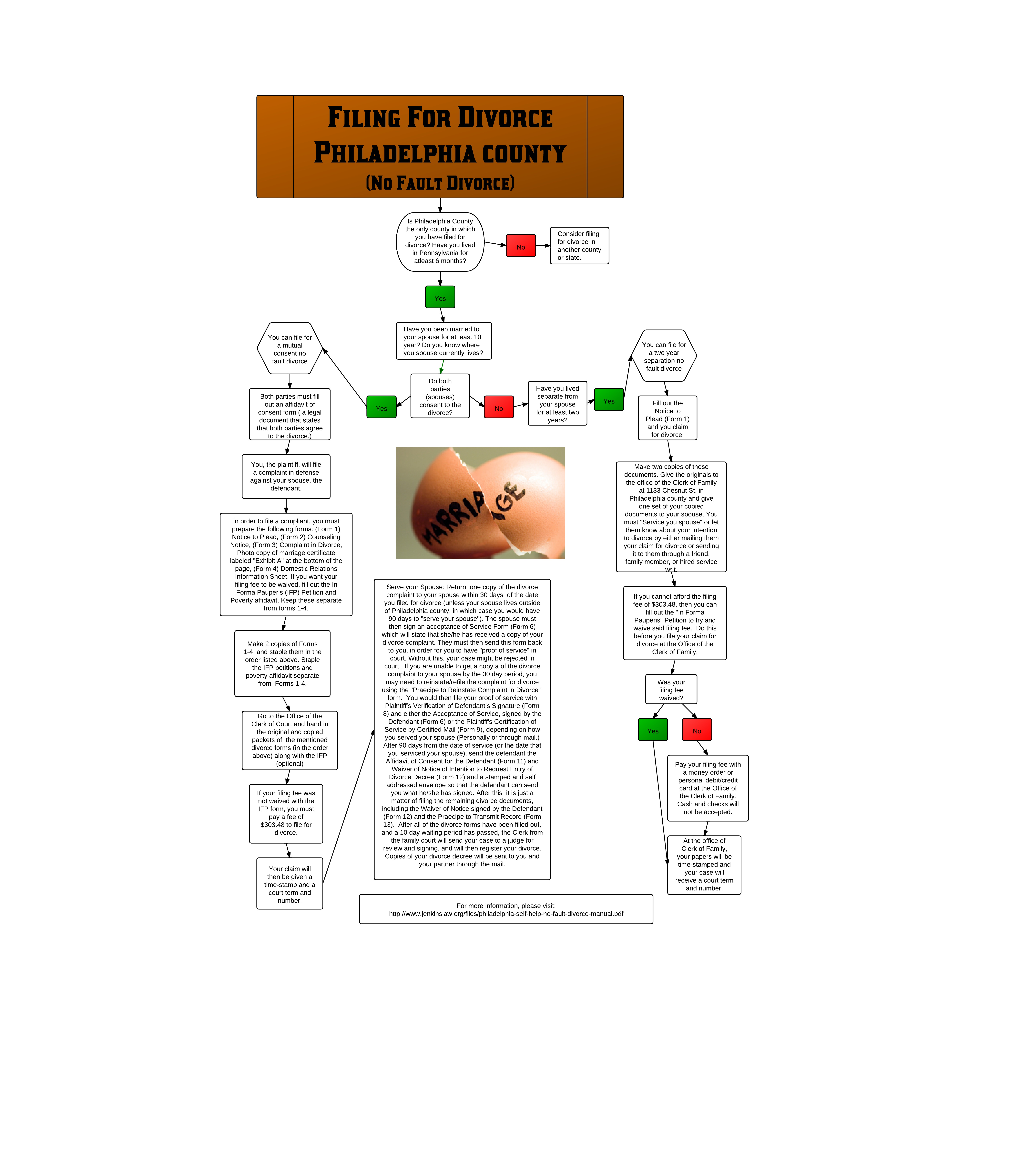 The process of filing for divorce is a very tedious one. You start out by filing your divorce complaint (which consists of filing out four forms that ask you personal information about yourself, your spouse, and your relationship with the later.) After this you must take these forms to the family court 1133 Chestnut St. to receive a court term and number for your claim. You must pay a filing fee of $303.48 to file your complaint. If you feel like you will not be able to afford paying this fee, you can try to fill out the In Forma Pauperis form, which requests that your filing fee be waived. After you have received your court term and number, you must “serve” your spouse by giving them a copy of the complaint that you filed at the family court- this basically just lets your spouse know that you want a divorce. They must then sign a paper that states that they received the divorce complaint, so that you can “prove your service” (or prove that you have notified your spouse about your intent to divorce) before you present your complaint in court. After you have “proved your service,” you must complete several other papers that prove that you have permission from your spouse to file for divorce and that line everything up for the court trial date. In the end, once all of your papers have been reviewed, you will receive a paper in the mail, documenting your divorce.