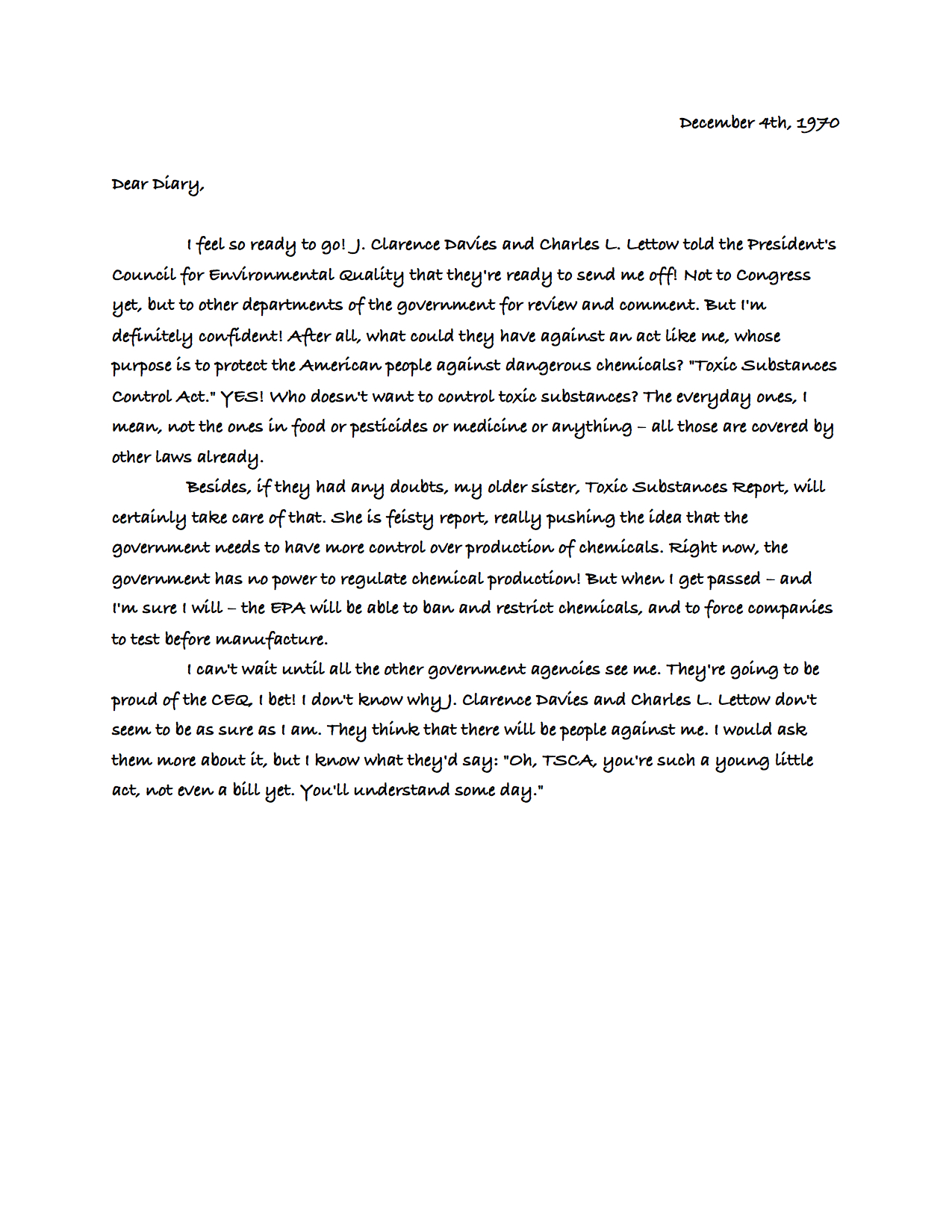 The most difficult part of this project for me was how much general information I found. I didn't know what to do with all of it, or how to find more specific facts about moments in the process. I was able to fix this problem by coming up with a method of presentation that restricted what I the information I needed. I chose the format of diary partly because of the specific information it would require (like particular dates and that kind of thing). I also chose the format because it allowed me to highlight the particular failures and accomplishments of TSCA by making up emotions for the bill itself. I had a lot of fun personifying TSCA.
