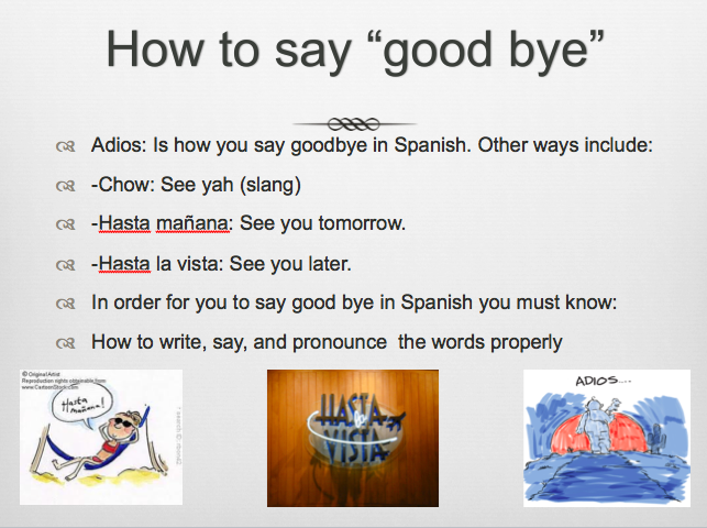 2. how to say good morning, goodbye, good afternoon, good night, hello, see you soon , see you later, see you to tomorrow.