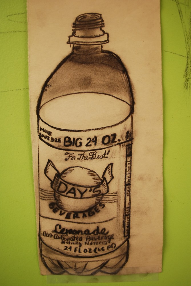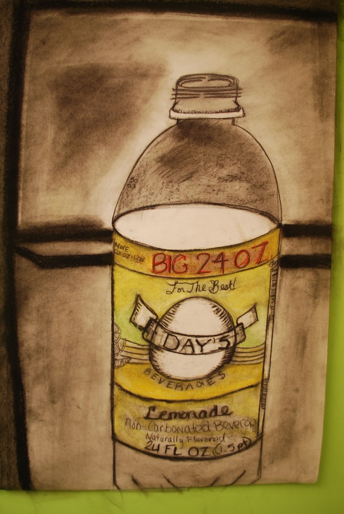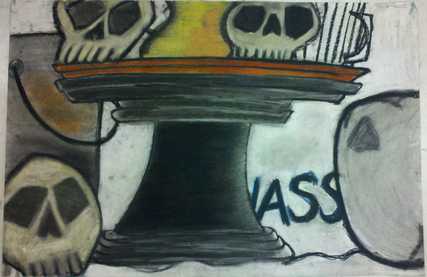 This to me was the hardest to draw because you had to look at every single detail in the picture. For example, I chose where I wanted to cut off my picture at, but I forgot that on the other side of the skull at the bottom there is Orange vase that reflects of the metal paint can. In here you can also see my artistic style, the boldness of the pieces.