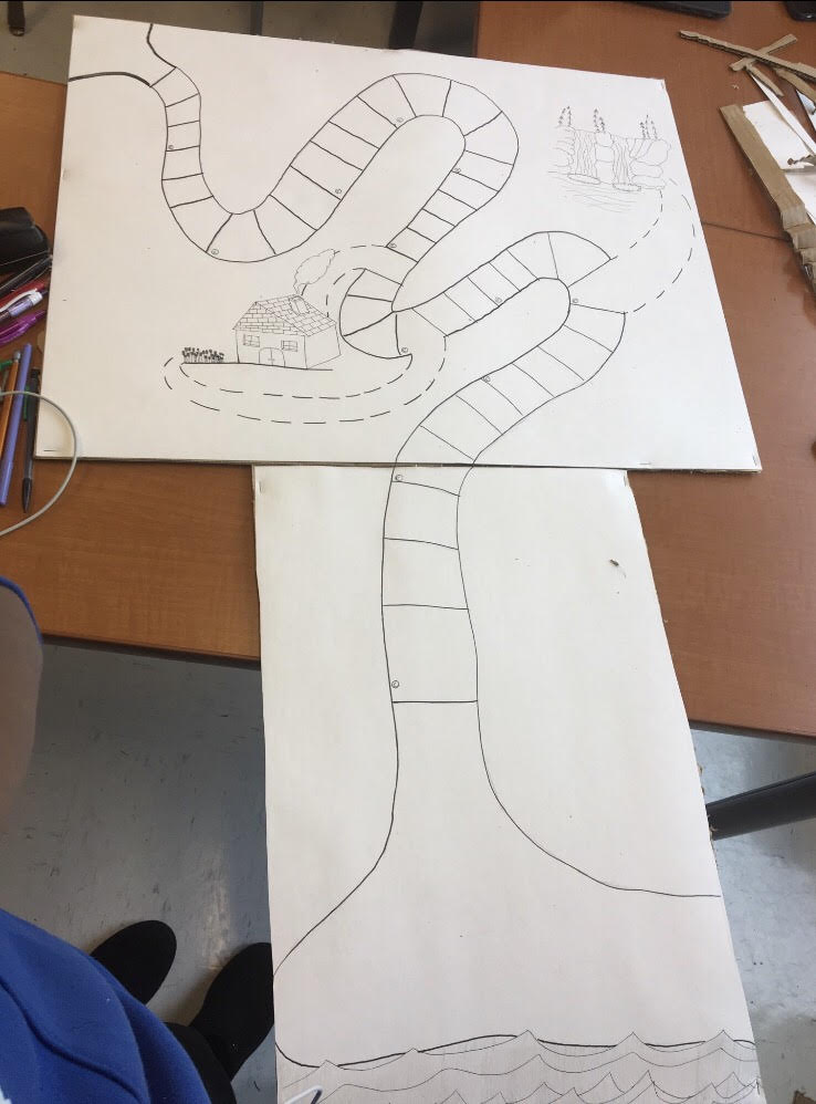 The game is played on a game board that represents a trail to a better destination. In order to travel, you will have to roll a die. Along the trail are symbols relating to four different types of cards. If you land on one of these symbols you have to pull a card pertaining to that symbol. The four types of cards are risk, reward, health and morality. A risk card will have a negative impact on your player (i.e., your player enters an empty house however in search of food, however they get hurt instead). A reward card will have a positive impact on your player. (i.e., your player finds multiple canned foods that are still good quality). A health card will affect your player’s physical and/or mental health (i.e., your player gets sick and their health goes down). A morality card will present you with a decision that will have a negative or positive impact depending on what you choose. This can increase or decrease your morality but benefit you in the game overall. You can keep track of these statistics by using a tally system on the note cards provided. Your main goal is to get to the end of the board first. If you do, the value system won’t apply to you.