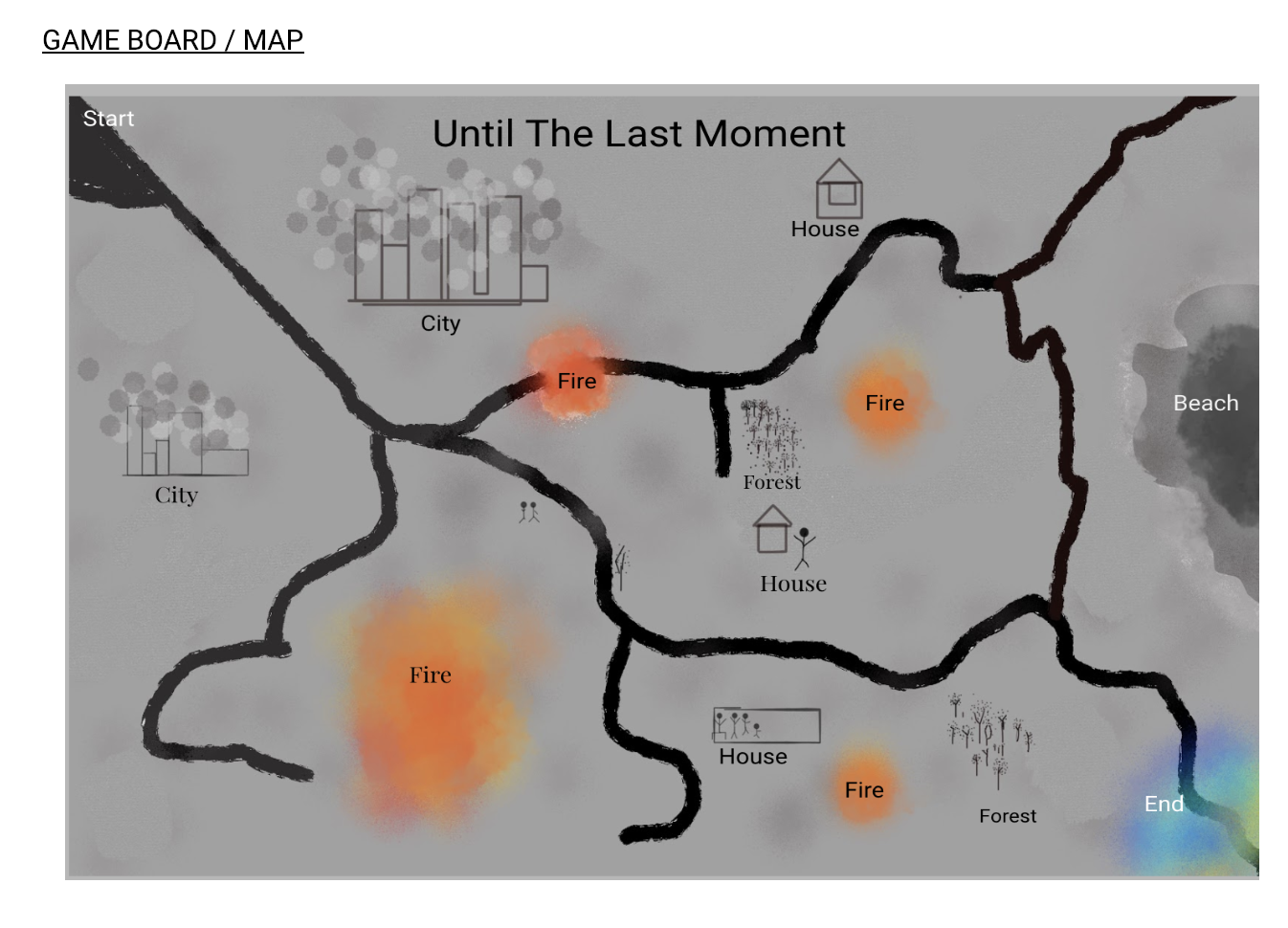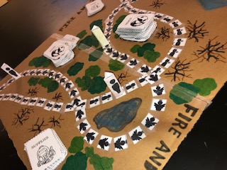 Our game combines player strategy with an inevitable construct of luck, or lack thereof. In the book, the father and the boy face a series of unfortunate events that out of their control, such as rainstorms and earthquakes. Many of our scenarios reflect this randomness. However, one of the underlying conflicts worked into the novel is the boy’s unwavering compassion for life versus the father’s self-centered will to survive, and how both dispositions simultaneously interfere and cooperate with certain aspects of the human identity. In an attempt to recreate this conflict, we have made it so that the goal of the game is to collect fire tokens, but all fire tokens will be null and void should someone lose all their survival tokens.