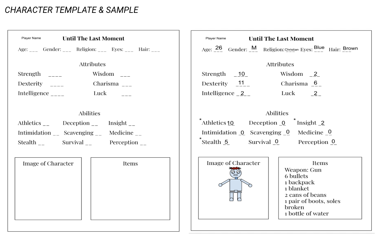 When making your character you get to choose attributes that will help him or her in certain situations but will also not be as much as an advantage in other situations. Attributes assigned to the characters will affect how they interact with the world around them. This game utilizes character customization: the players will be able to create their characters, including choosing their attributes. Players will roll a pair of 6-sided dice in order to find how many points will be allotted to each attribute. Certain attributes will be beneficial in certain scenarios, while others will have no effect or can even be detrimental. The higher the number a player rolls, the more points they might be able to allot to their desired attribute. Workaround the scenarios of the game master, make the right choices, and survive as long as you can.