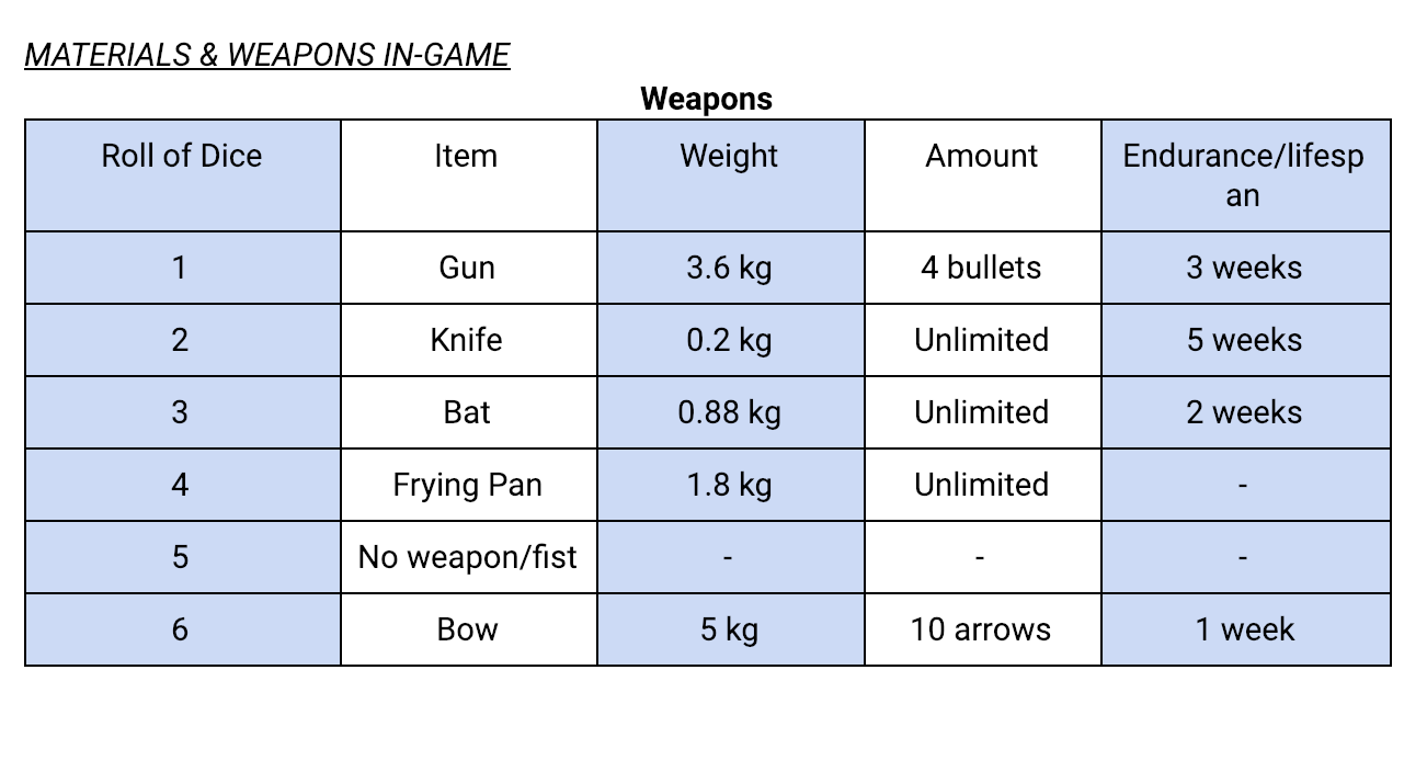 The Game Master will give the players a list of items for them to start the game with. Characters have a limit of 3 items*, excluding their weapon. The weapons will be chosen by rolling a die.