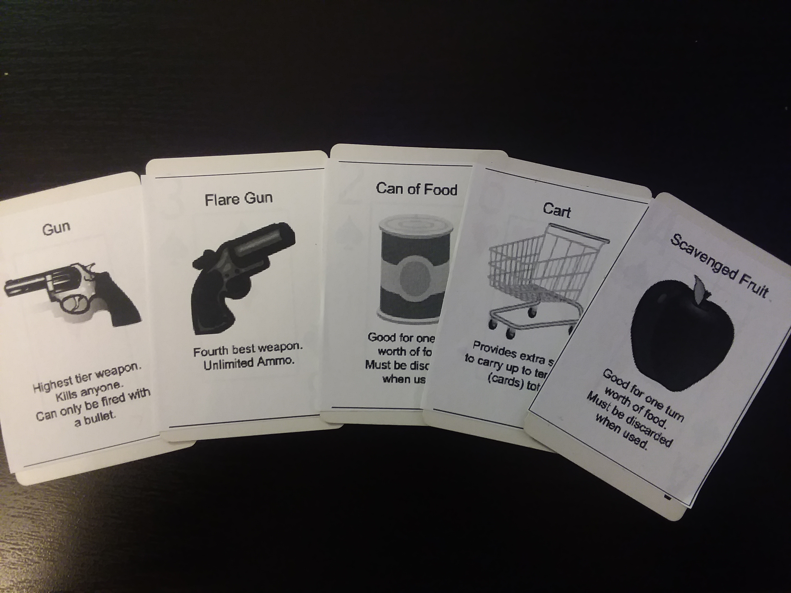 Supply cards contain supplies such as guns, food, water, clothing, tarp, etc.