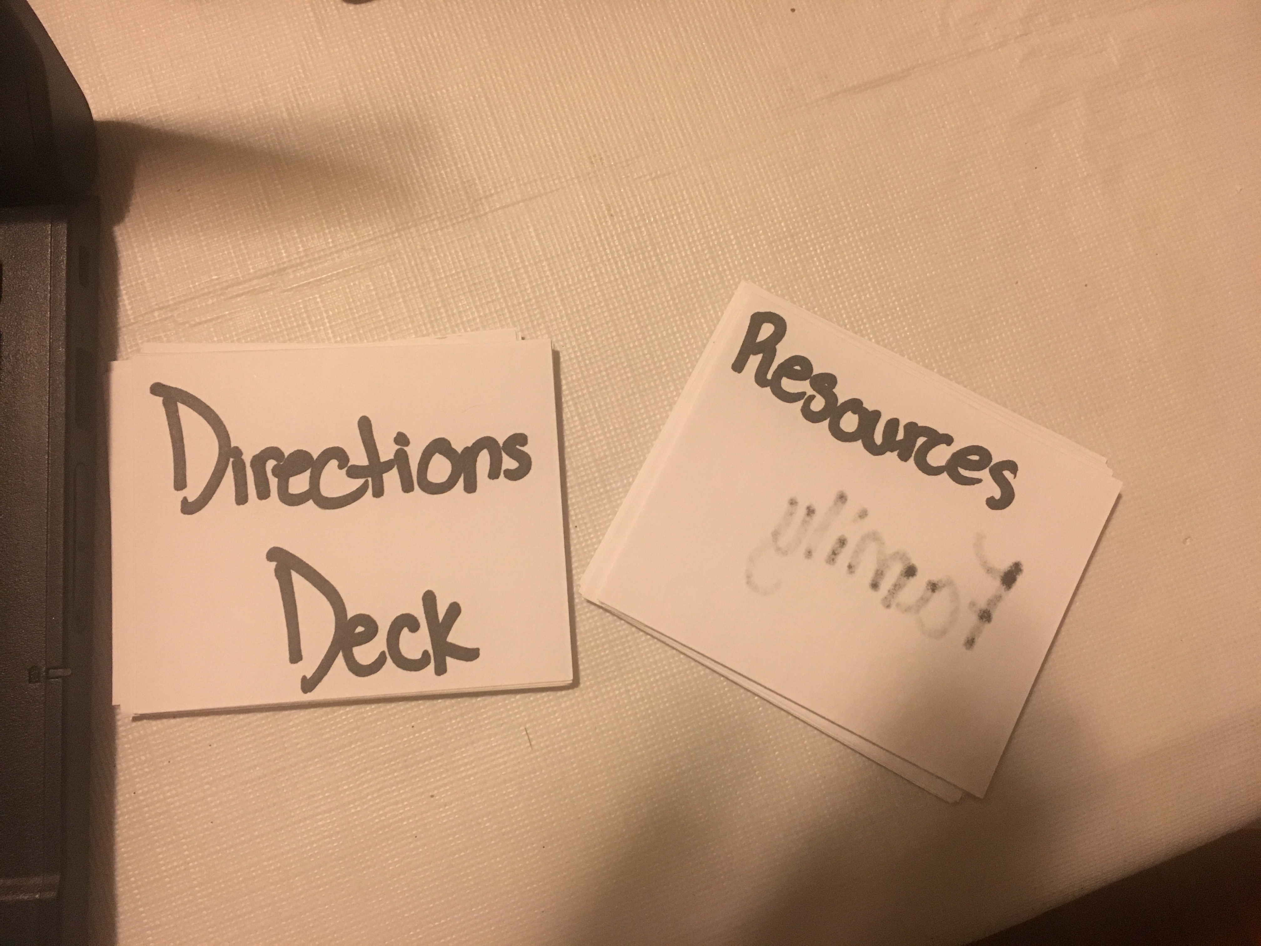Players should keep the cards that they have (Resource deck) to themselves unless they decide before the first Direction card is chosen that they would like to play as a team with up to one other player. If two players decide to become a team they will have to share their cards from the Resource deck throughout the entire game.