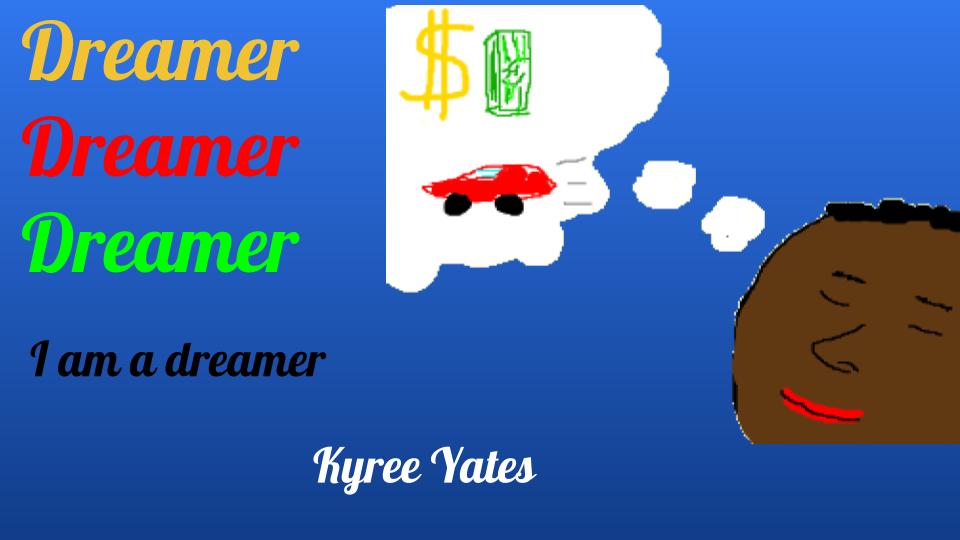 For my slide in the beginning I really had some trouble figuring out what to write about. I kept on saying to myself how are you supposed to describe yourself with only a few words and one slide. So I told myself to sit back and relax so you can figure out a word. So while I was thinking I started day dreaming, then it hit me. I am a dreamer. I have bring dreams and set very high expectations for myself. Every day I think about playing in the NFL because that is my big dream that I want to and am going to succeed at. So that's why I chose the picture for my slide, a boy dreaming big. For my slide design what I did was put a blue gradient back with the words dreamer to match my contrats in the back. I chose blue because it’s a type of pop color.