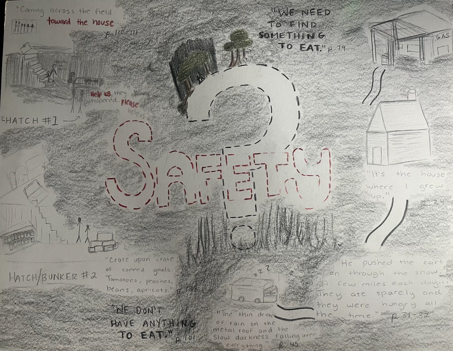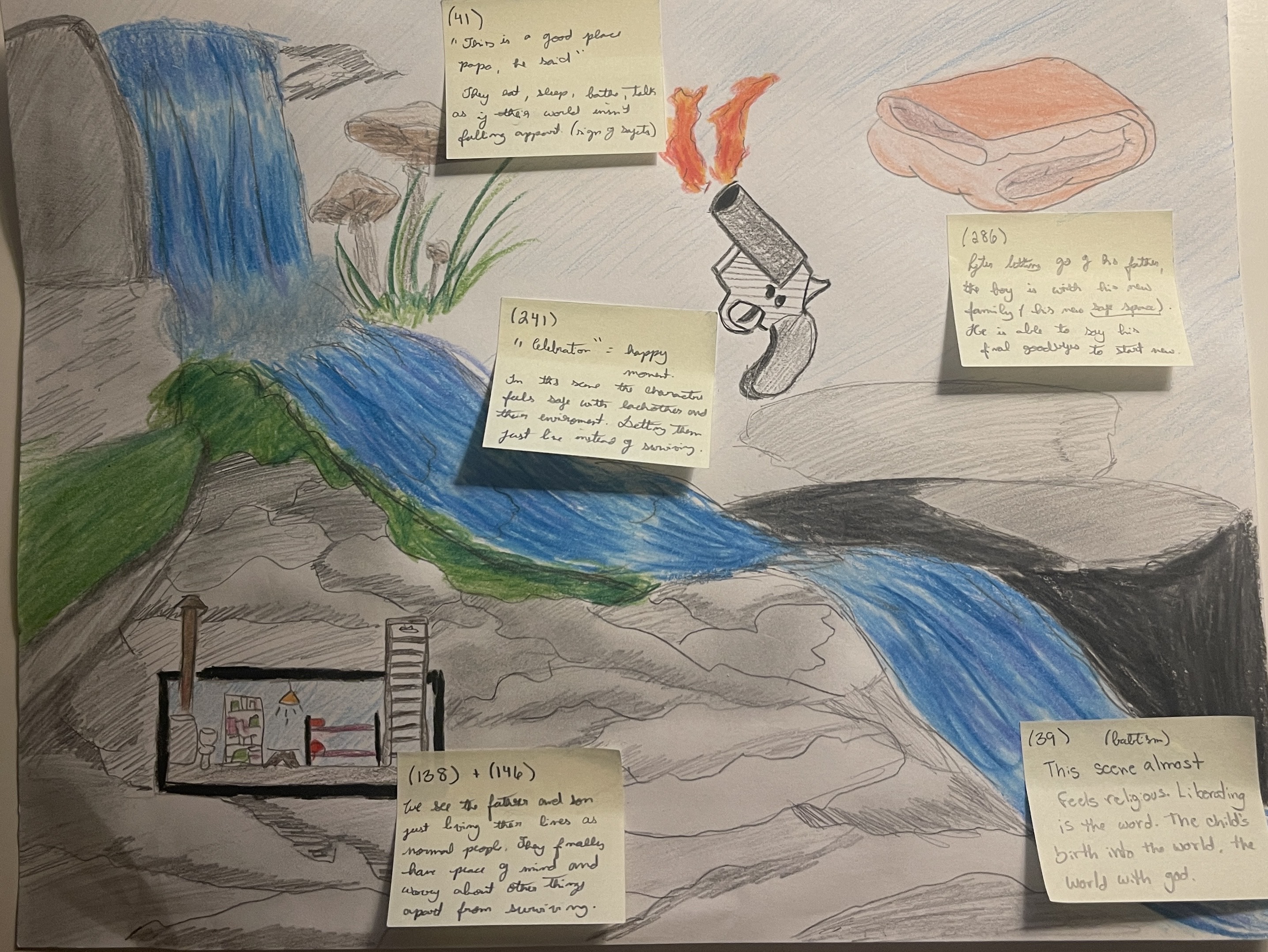 Throughout their journey, the father had been sick. He was constantly coughing and taking breaks to catch his breath, and eventually, it came to a head. The father knew he was dying, and the son didn’t know what to do. He was overwhelmed with emotions, and couldn’t imagine his dad leaving him. “He slept close to his father that night and held him but when he woke up in the morning his father was cold and stiff.” (pg. 281) The son stayed by his father for days but finally decided to venture up the road. He ran into a man on the road and when they went back to where his father laid to rest, the man from the road told the boy he needed to keep moving. The son wanted to bring his father with him, but the man told him how unrealistic that was. He said his final goodbyes and off he went.