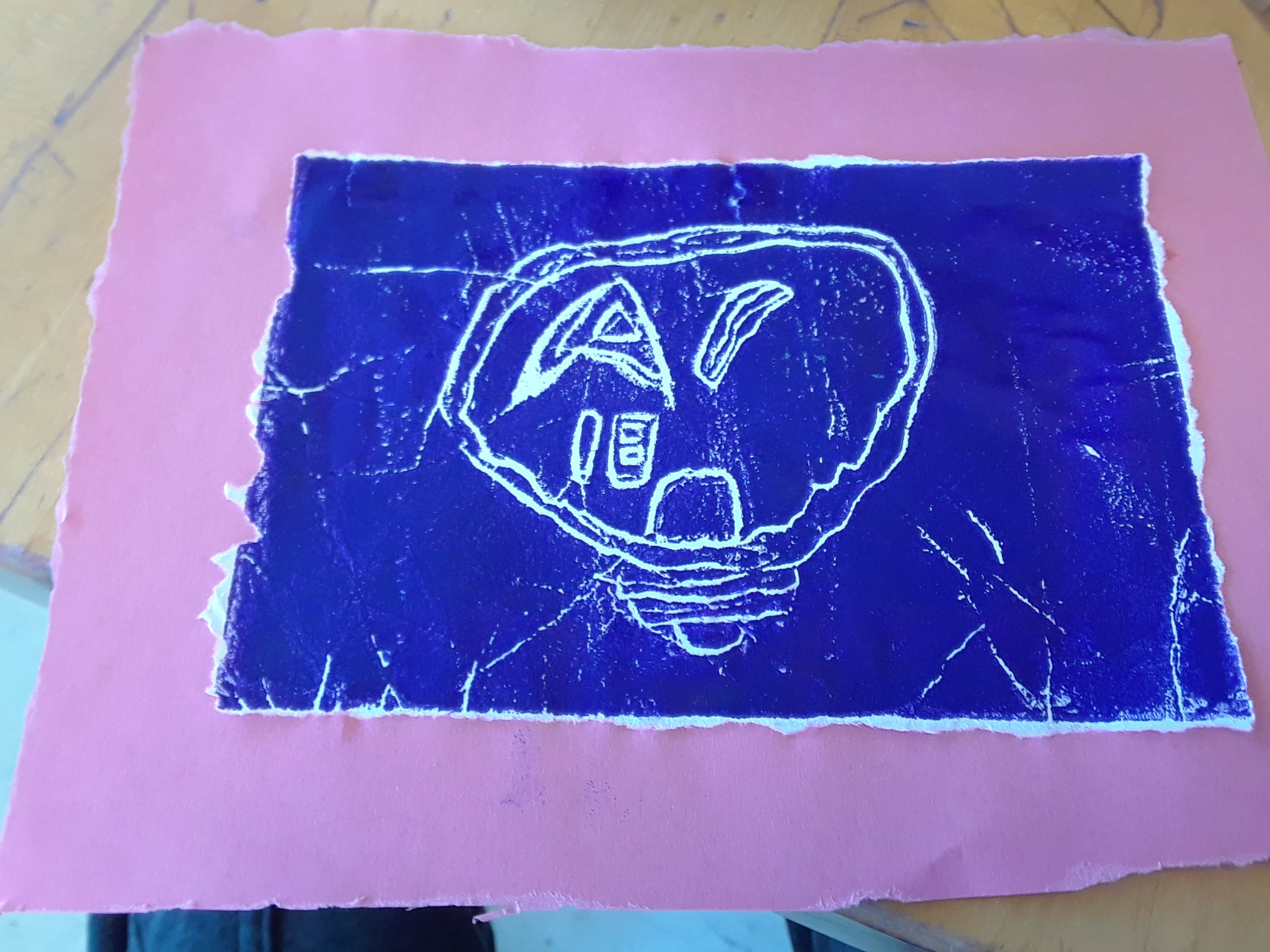 As for my process, there were many steps. After I had my lineart for my picture, I then had to decide what would be the positive and what would be the negative space. I then used a sharpie to fill in what would be my negative space (this space acted as positive space at some points). After this, I traced and transferred just the outlines of my image to a piece of tracing paper. I then flipped the paper over so the letters and numbers were backwards, and used a pencil to press through the lines on the paper and onto a foam base. This would serve as my printing plate. I would then roll ink on the plate and press it onto paper, flip it over, and use a wooden spoon to press it down. This transferred my image right side up, and then I was done!
