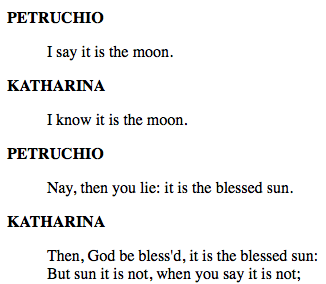 In this excerpt from the play, Katherine and Petruchio are arguing over whether the sun or the moon is in the sky. Katherine know it is the sun in the sky, but Petruchio will not agree with her. Hortensio, friend and wingman to Petruchio, insist that Katherine agree with Petruchio or the argument will never drop. Once Katherine gives in and agrees with Petruchio, he then rebuttals his arguments saying the sun is indeed in the sky and Katherine had just lied. Petruchio now sees Katherine as his puppet; he owns her. She will now do or say whatever he wants. At this point in the play Katherine goes along with Petruchio's ideas to avoid conflict with him. This tactic of “giving in” is also used in the movie.
